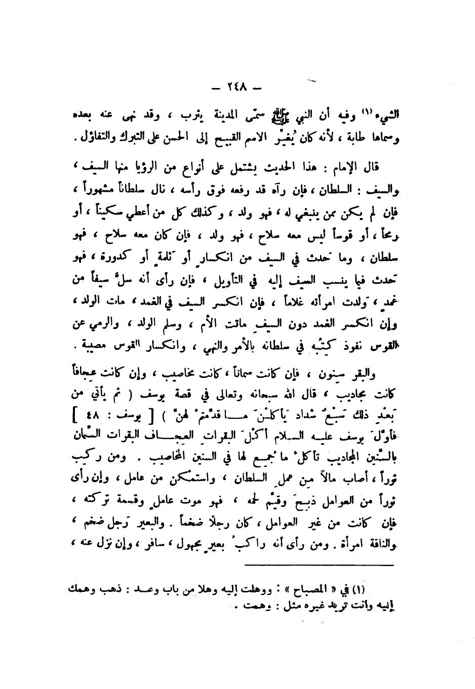 قَالَ الْإِمَام: هَذَا الحَدِيث يشْتَمل عَلَى أَنْوَاع مِن الرُّؤْيَا مِنْهَا السَّيْف، وَالسيف السّلطان، فَإِن رَآهُ قد رَفعه فَوق رَأسه، نَالَ سُلْطَانا مَشْهُورا، فَإِن لم يكن مِمَّن يَنْبَغِي لَهُ، فَهُوَ وُلِدَ، وَكَذَلِكَ كل مِن أعطي سكينا، أَو رمحا، أَو قوسا لَيْسَ مَعَه سلَاح، فَهُوَ وُلِدَ، فَإِن كَانَ مَعَه سلَاح، فَهُوَ سُلْطَان، وَمَا حدث فِي السَّيْف مِن انكسار أَو ثلمة أَو كدورة، فَهُوَ حدث فِيمَا ينْسب السَّيْف إِلَيْهِ فِي التَّأْوِيل، فَإِن رَأَى أَنَّهُ سل سَيْفا مِن غمد، ولدت امْرَأَته غُلَاما، فَإِن انْكَسَرَ السَّيْف فِي الغمد، مَاتَ الْوَلَد، وَإِن انْكَسَرَ الغمد دون السَّيْف، مَاتَت الْأُم، وَسلم الْوَلَد.