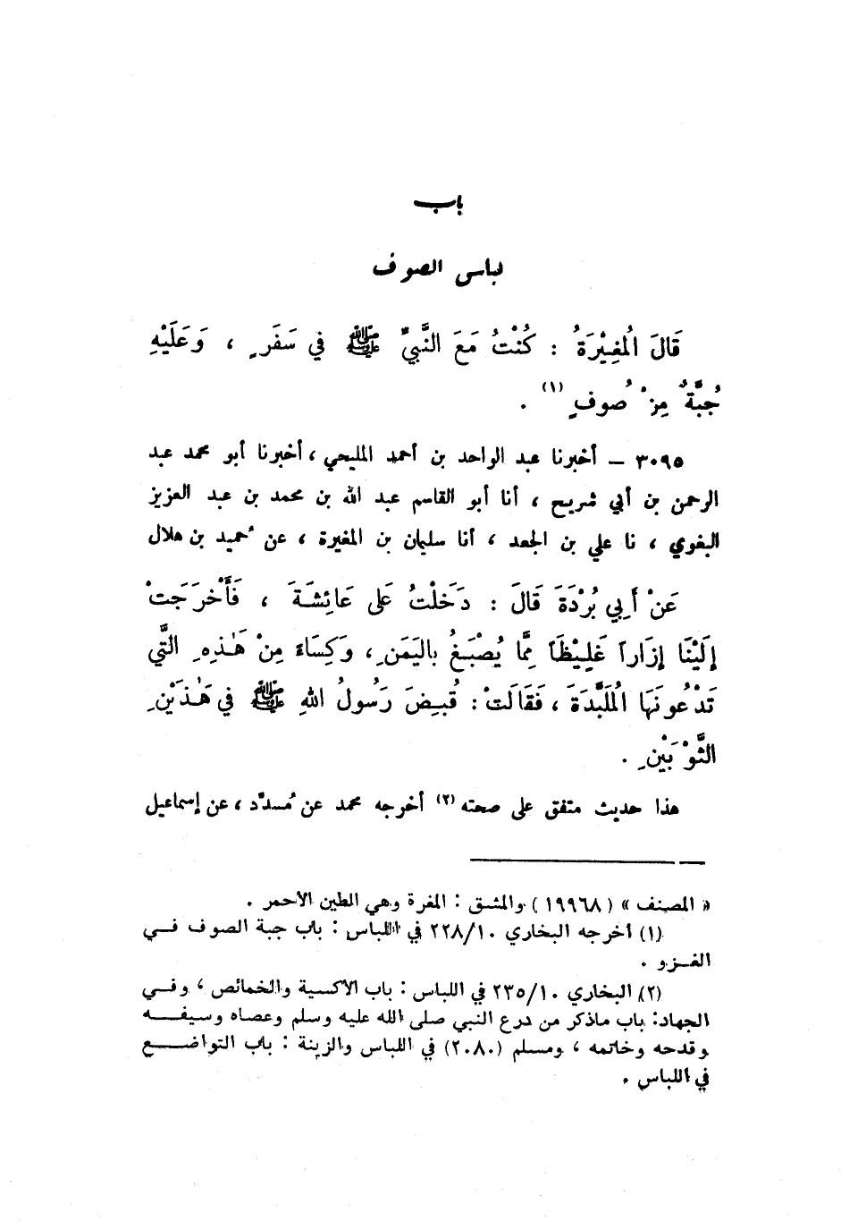 قَالَ الْمُغِيرَةُ: «كُنْتُ مَعَ النَّبِيِّ صَلَّى اللهُ عَلَيْهِ وَسَلَّمَ فِي سَفَرٍ، وَعَلَيْهِ جُبَّةٌ مِنْ صُوفٍ»