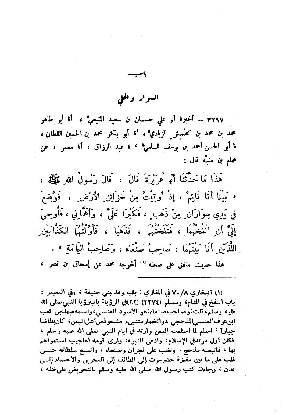 3297 - أَخْبَرَنَا أَبُو عَلِيٍّ حَسَّانُ بْنُ سَعِيدٍ الْمَنِيعِيُّ، أَنا أَبُو طَاهِرٍ مُحَمَّدُ بْنُ مُحَمَّدِ بْنِ مَحْمِشٍ الزِّيَادِيُّ، أَنا أَبُو بَكْرٍ مُحَمَّدُ بْنُ الْحُسَيْنِ الْقَطَّانُ، نَا أَبُو الْحَسَنِ أَحْمَدُ بْنُ يُوسُفَ السُّلَمِيُّ، نَا عَبْدُ الرَّزَّاقِ، أَنا مَعْمَرٌ، عَنْ هَمَّامِ بْنِ مُنَبِّهٍ، قَالَ: هَذَا مَا حَدَّثَنَا أَبُو هُرَيْرَةَ، قَالَ: قَالَ رَسُولُ اللَّهِ صَلَّى اللهُ عَلَيْهِ وَسَلَّمَ: " بَيْنَمَا أَنَا نَائِمٌ، إذْ أُوتِيتُ مِنْ خَزَائِنِ الأَرْضِ، فَوُضِعَ فِي يَدِي سِوَارَانِ مِنْ ذَهَبٍ، فَكَبُرَا عَلَيَّ، وَأَهَمَّانِي، فَأُوحِيَ إِلَيَّ أَنِ انْفُخْهُمَا، فَنَفَخْتُهُمَا، فَذَهَبَا، فَأَوَّلْتُهُمَا الْكَذَّابَيْنِ اللَّذَيْنِ أَنَا بَيْنَهُمَا: صَاحِبُ صَنْعَاءَ، وَصَاحِبُ الْيَمَامَةِ ".