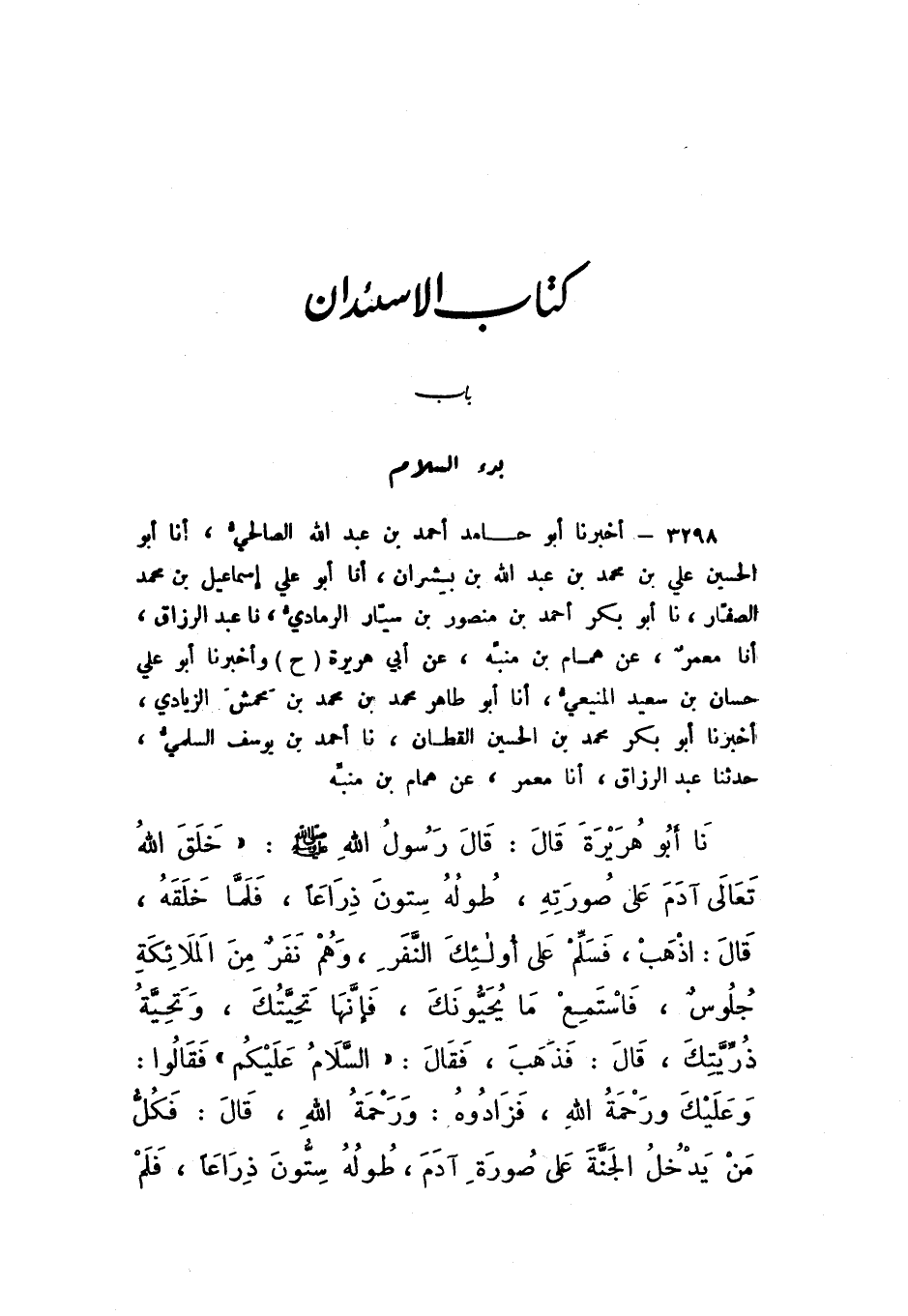 ح وَأَخْبَرَنَا أَبُو عَلِيٍّ حَسَّانُ بْنُ سَعِيدٍ الْمَنِيعِيُّ، أَنا أَبُو طَاهِرٍ مُحَمَّدُ بْنُ مُحَمَّدِ بْنِ مَحْمِشٍ الزِّيَادِيُّ، أَخْبَرَنَا أَبُو بَكْرٍ مُحَمَّدُ بْنُ الْحُسَيْنِ الْقَطَّانُ، نَا أَحْمَدُ بْنُ يُوسُفَ السُّلَمِيُّ، حَدَّثَنَا عَبْدُ الرَّزَّاقِ، أَنا مَعْمَرٌ، عَنْ هَمَّامِ بْنِ مُنَبِّهٍ، نَا أَبُو هُرَيْرَةَ، قَالَ: قَالَ رَسُولُ اللَّهِ صَلَّى اللهُ عَلَيْهِ وَسَلَّمَ: " خَلَقَ اللَّهُ تَعَالَى آدَمَ عَلى صُورَتِهِ، طُولُهُ سِتُّونَ ذِرَاعًا، فَلَمَّا خَلَقَهُ، قَالَ: اذْهَبْ، فَسَلِّمْ عَلَى أُولَئِكَ النَّفَرِ، وَهُمْ نَفَرٌ مِنَ الْمَلائِكَةِ جُلُوسٌ، فَاسْتَمِعْ مَا يُحَيُّونَكَ، فَإِنَّهَا تَحِيَّتُكَ، وَتَحِيَّةُ ذُرِّيَّتِكَ، قَالَ: فَذَهَبَ، فَقَالَ: السَّلامُ عَلَيْكُمْ، فَقَالُوا: وَعَلَيْكَ وَرَحْمَةُ اللَّهِ، فَزَادُوهُ: وَرَحْمَةُ اللَّهِ، قَالَ: فَكُلُّ مَنْ يَدْخُلُ الْجَنَّةَ عَلى صُورَةِ آدَمَ، طُولُهُ سِتُّونَ ذِرَاعًا، فَلَمْ