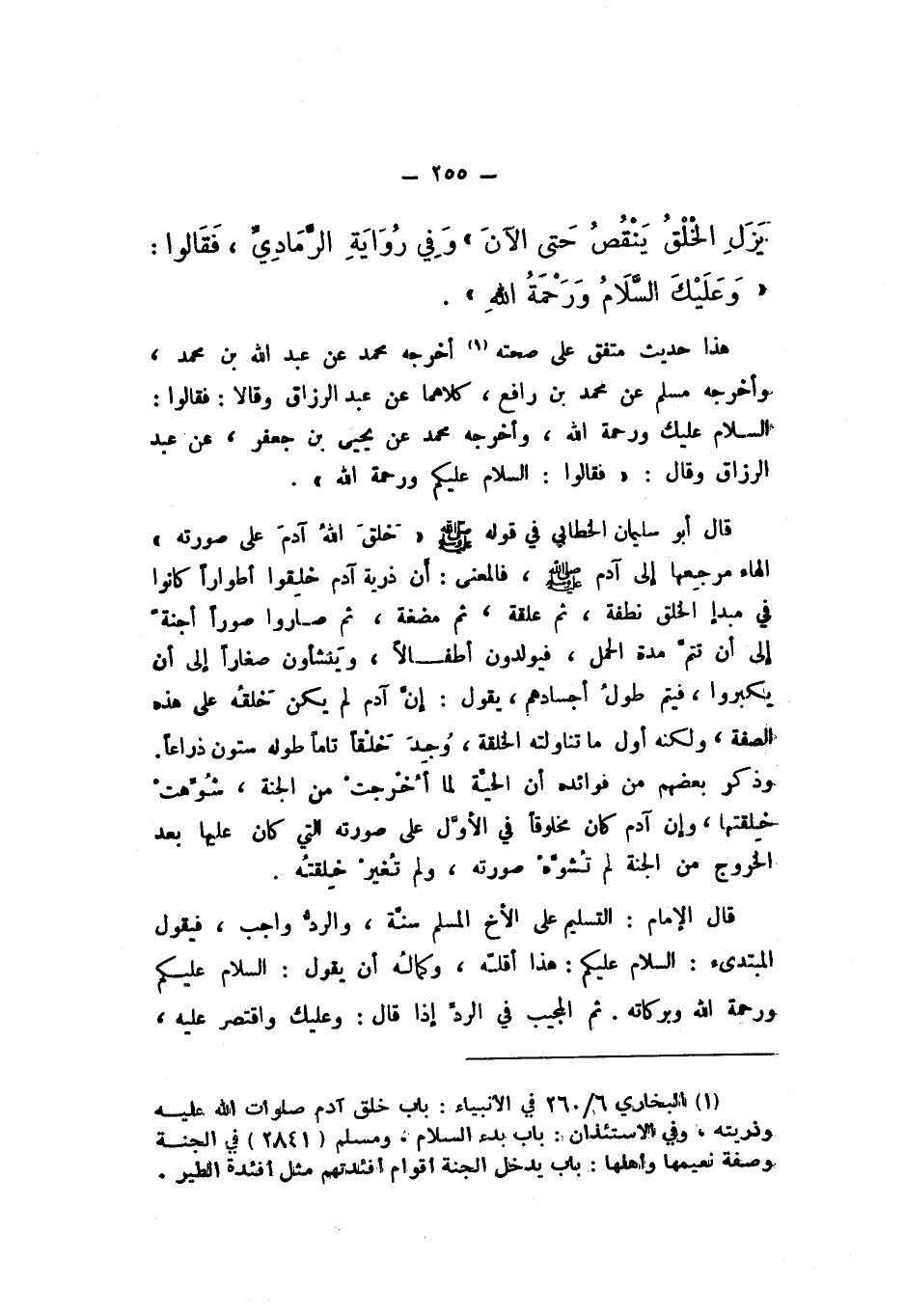قَالَ الْإِمَام: التَّسْلِيم عَلَى الْأَخ الْمُسلم سنة، وَالرَّدّ وَاجِب، فَيَقُول الْمُبْتَدِئ: السَّلَام عَلَيْكُم، هَذَا أَقَله، وكماله أَن يَقُولُ: السَّلَام عَلَيْكُم وَرَحْمَة اللَّه وَبَرَكَاته.