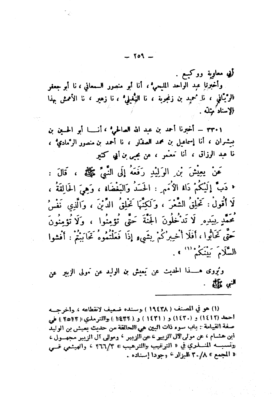 3301 - أَخْبَرَنَا أَحْمَدُ بْنُ عَبْدِ اللَّهِ الصَّالِحِيُّ، أَنا أَبُو الْحُسَيْنِ بْنُ بِشْرَانَ، أَنا إِسْمَاعِيلُ بْنُ مُحَمَّدٍ الصَّفَّارُ، نَا أَحْمَدُ بْنُ مَنْصُورٍ الرَّمَادِيُّ، نَا عَبْدُ الرَّزَّاقِ، أَنا مَعْمَرٌ، عَنْ يَحْيَى بْنِ أَبِي كَثِيرٍ، عَنْ يَعِيشَ بْنِ الْوَلِيدِ، رَفَعَهُ إلَى النَّبِيِّ صَلَّى اللهُ عَلَيْهِ وَسَلَّمَ، قَالَ: " دَبَّ إِلَيْكُمْ دَاءُ الأُمَمِ: الْحَسَدُ وَالْبَغْضَاءُ، وَهِيَ الْحَالِقَةُ، لَا أَقُولُ: تَحْلِقُ الشَّعْرَ، وَلَكِنَّهَا تَحْلِقُ الدِّينَ، وَالَّذِي نَفْسُ مُحَمَّدٍ بِيَدِهِ لَا تَدْخُلُونَ الْجَنَّةَ حَتَّى تُؤْمِنُوا، وَلا تُؤْمِنُونَ حَتَّى تَحَابُّوا، أَفَلا أُخْبِرُكُمْ بِشَيْءٍ إِذَا فَعَلْتُمُوهُ تَحَابَبْتُمْ: أَفْشُوا السَّلامَ بَيْنَكُمْ ".
