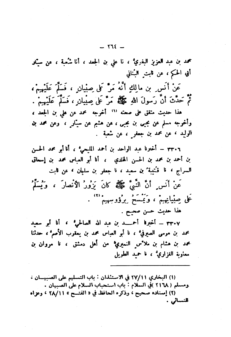 3306 - أَخْبَرَنَا عَبْدُ الْوَاحِدِ بْنُ أَحْمَدَ الْمَلِيحِيُّ، أَنا أَبُو مُحَمَّدٍ الْحَسَنُ بْنُ أَحْمَدَ بْنِ مُحَمَّدِ بْنِ الْحَسَنِ الْمَخْلَدِيُّ، أَنا أَبُو الْعَبَّاسِ مُحَمَّدُ بْنُ إِسْحَاقَ السَّرَّاجُ، نَا قُتَيْبَةُ بْنُ سَعِيدٍ، نَا جَعْفَرُ بْنُ سُلَيْمَانَ، عَنْ ثَابِتٍ، عَنْ أَنَسٍ، «أَنَّ النَّبِيَّ صَلَّى اللهُ عَلَيْهِ وَسَلَّمَ كَانَ يَزُورُ الأَنْصَارَ، وَيُسَلِّمُ عَلَى صِبْيَانِهِمْ، وَيَمْسَحُ بِرُءُوسِهِمْ».
