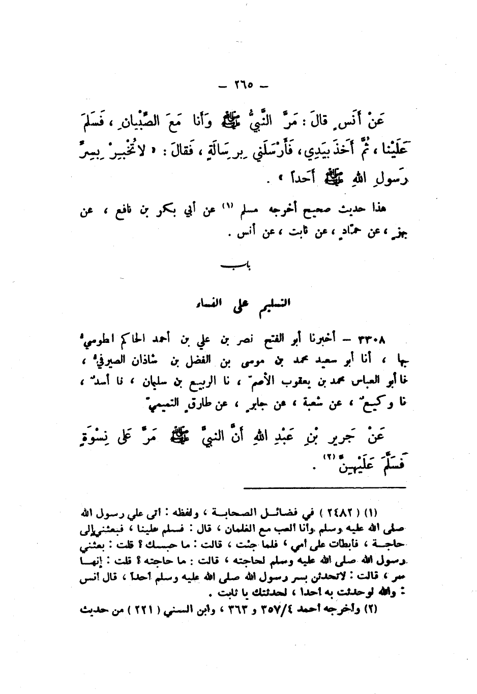 3308 - أَخْبَرَنَا أَبُو الْفَتْحِ نَصْرُ بْنُ عَلِيِّ بْنِ أَحْمَدَ الْحَاكِمُ الطُّوسِيُّ، بِهَا، أَنا أَبُو سَعِيدٍ مُحَمَّدُ بْنُ مُوسَى بْنِ الْفَضْلِ بْنِ شَاذَانَ الصَّيْرَفِيُّ، نَا أَبُو الْعَبَّاسِ مُحَمَّدُ بْنُ يَعْقُوبَ الأَصَمُّ، نَا الرَّبِيعُ بْنُ سُلَيْمَانَ، نَا أَسَدٌ، نَا وَكِيعٌ، عَنْ شُعْبَةَ، عَنْ جَابِرٍ، عَنْ طَارِقٍ التَّمِيمِيُّ، عَنْ جَرِيرِ بْنِ عَبْدِ اللَّهِ، «أَنَّ النَّبِيَّ صَلَّى اللهُ عَلَيْهِ وَسَلَّمَ مَرَّ عَلَى نِسْوَةٍ فَسَلَّمَ عَلَيْهِنَّ»