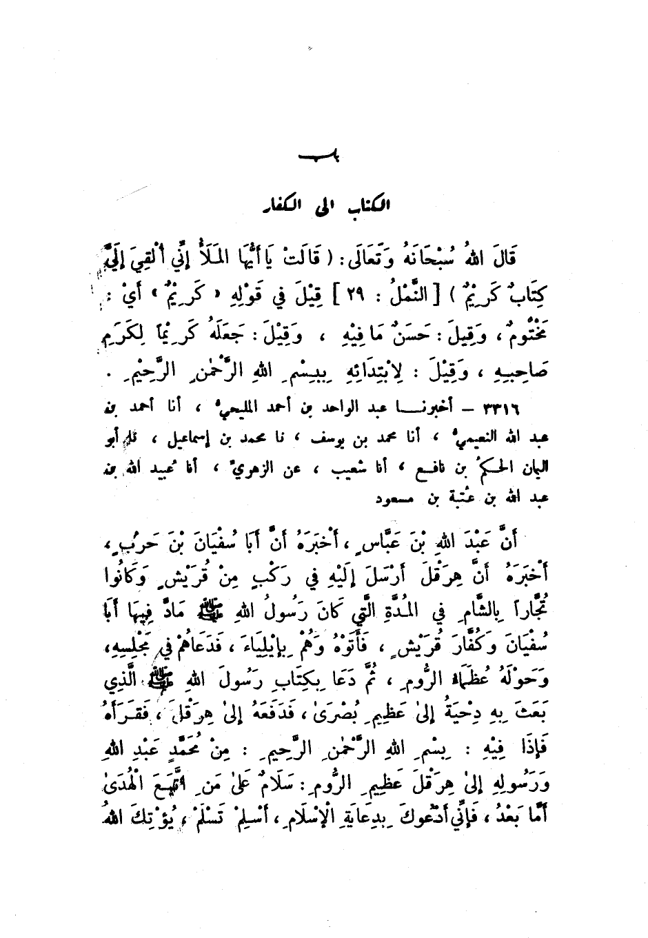 3316 - أَخْبَرَنَا عَبْدُ الْوَاحِدِ بْنُ أَحْمَدَ الْمَلِيحِيُّ، أَنا أَحْمَدُ بْنُ عَبْدِ اللَّهِ النُّعَيْمِيُّ، أَنا مُحَمَّدُ بْنُ يُوسُفَ، نَا مُحَمَّدُ بْنُ إِسْمَاعِيلَ، نَا أَبُو الْيَمَانِ الْحَكَمُ بْنُ نَافِعٍ، أَنا شُعَيْبٌ، عَنِ الزُّهْرِيِّ، أَنا عُبَيْدُ اللَّهِ بْنُ عَبْدِ اللَّهِ بْنِ عُتْبَةَ بْنِ مَسْعُودٍ، أَنَّ عَبْدَ اللَّهِ بْنَ عَبَّاسٍ، أَخْبَرَهُ أَنَّ أَبَا سُفْيَانَ بْنَ حَرْبٍ، أَخْبَرَهُ " أَنَّ هِرَقْلَ أَرْسَلَ إِلَيْهِ فِي رَكْبٍ مِنْ قُرَيْشٍ، وَكَانُوا تُجَّارًا بِالشَّامِ فِي الْمُدَّةِ الَّتِي كَانَ رَسُولُ اللَّهِ صَلَّى اللهُ عَلَيْهِ وَسَلَّمَ مَادَّ فِيهَا أَبَا سُفْيَانَ وَكُفَّارَ قُرَيْشٍ، فَأَتَوْهُ وَهُمْ بِإِيلِيَاءَ، فَدَعَاهُمْ فِي مَجْلِسِهِ، وَحَوْلَهُ عُظَمَاءُ الرُّومِ، ثُمَّ دَعَا بِكِتَابِ رَسُولِ اللَّهِ صَلَّى اللهُ عَلَيْهِ وَسَلَّمَ الَّذِي بَعَثَ بِهِ دِحْيَةَ إِلَى عَظِيمِ بُصْرَى، فَدَفَعَهُ إِلَى هِرَقْلَ، فَقَرَأَهُ فَإِذَا فِيهِ: بِسْمِ اللَّهِ الرَّحْمَنِ الرَّحِيمِ: مِنْ مُحَمَّدٍ عَبْدِ اللَّهِ وَرَسُولِهِ إِلَى هِرَقْلَ عَظِيمِ الرُّومِ: سَلامٌ عَلَى مَنِ اتَّبَعَ الْهُدَى، أَمَّا بَعْدُ، فَإِنِّي أَدْعُوكَ بِدِعَايَةِ الإِسْلامِ، أَسْلِمْ تَسْلَمْ، يُؤْتِكَ اللَّهُ