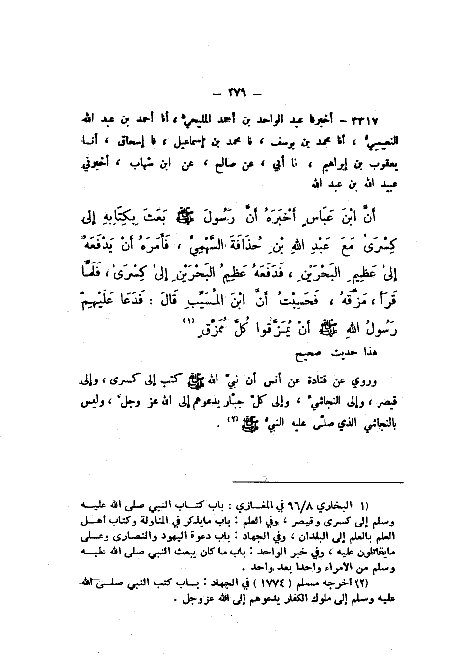 3317 - أَخْبَرَنَا عَبْدُ الْوَاحِدِ بْنُ أَحْمَدَ الْمَلِيحِيُّ، أَنا أَحْمَدُ بْنُ عَبْدِ اللَّهِ النُّعَيْمِيُّ، أَنا مُحَمَّدُ بْنُ يُوسُفَ، نَا مُحَمَّدُ بْنُ إِسْمَاعِيلَ، نَا إِسْحَاقُ، أَنا يَعْقُوبُ بْنُ إِبْرَاهِيمَ، نَا أَبِي، عَنْ صَالِحٍ، عَنِ ابْنِ شِهَابٍ، أَخْبَرَنِي عُبَيْدُ اللَّهِ بْنُ عَبْدِ اللَّهِ، أَنَّ ابْنَ عَبَّاسٍ، أَخْبَرَهُ " أَنَّ رَسُولَ اللَّهِ صَلَّى اللهُ عَلَيْهِ وَسَلَّمَ بَعَثَ بِكِتَابِهِ إِلَى كِسْرَى مَعَ عَبْدِ اللَّهِ بْنِ حُذَاقَةَ السَّهْمِيِّ، فَأَمَرَهُ أَنْ يَدْفَعَهُ إِلَى عَظِيمِ الْبَحْرَيْنِ، فَدَفَعَهُ عَظِيمُ الْبَحْرَيْنِ إِلَى كِسْرَى، فَلَمَّا قَرَأَ مَزَّقَهُ، فَحَسِبْتُ أَنَّ ابْنَ الْمُسَيِّبِ قَالَ: فَدَعَا عَلَيْهِمْ رَسُولُ اللَّهِ صَلَّى اللهُ عَلَيْهِ وَسَلَّمَ أَنْ يُمَزَّقُوا كُلَّ مُمَزَّقٍ ".