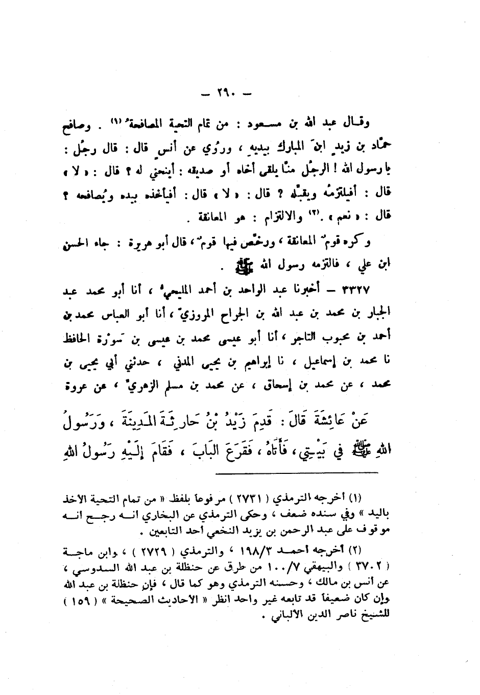 وَصَافَحَ حَمَّادَ بْنَ زَيْدِ ابْنِ الْمُبَارَكِ بِيَدَيْهِ، وَرُوِيَ عَنْ أَنَسٍ، قَالَ: قَالَ رَجُلٌ: يَا رَسُولَ اللَّهِ، الرَّجُلُ مِنَّا يَلْقَى أَخَاهُ أَوْ صَدِيقَهُ، أَيَنْحَنِي لَهُ؟ قَالَ: «لَا»، قَالَ: أَفَيَلْتَزِمُهُ وَيُقَبِّلُهُ؟ قَالَ: «لَا»، قَالَ: أَفَيَأْخُذُ بِيَدِهِ وَيُصَافِحُهُ؟ قَالَ: «نَعَمْ».