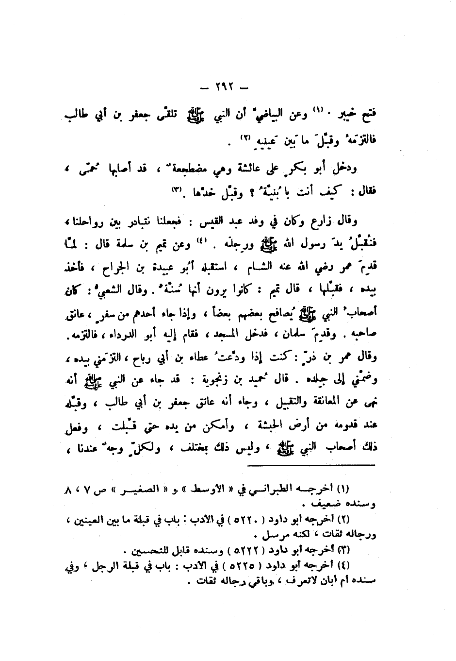 قَالَ حميد بْن زَنْجوَيْه: قد جَاءَ عَن النَّبِيّ أَنَّهُ «نهى عَن المعانقة والتقبيل، وَجَاء أَنَّهُ عانق جَعْفَر بْن أَبِي طَالب، وَقَبله عِنْد قدومه مِن أَرض الْحَبَشَة، وَأمكن مِن يَده حَتَّى قبلت»، وَفعل ذَلِكَ أَصْحَاب النَّبِيّ صَلَّى اللهُ عَلَيْهِ وَسَلَّمَ، وَلَيْسَ ذَلِكَ بمختلف، وَلكُل وَجه عندنَا،