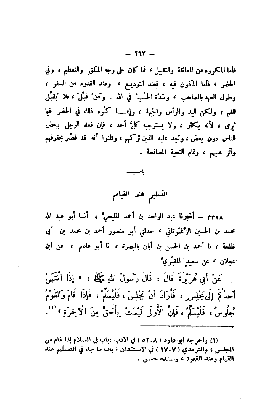 3328 - أَخْبَرَنَا عَبْدُ الْوَاحِدِ بْنُ أَحْمَدَ الْمَلِيحِيُّ، أَنا أَبُو عَبْد اللَّهِ مُحَمَّدُ بْنُ الْحُسَيْنِ الزَّغَرْتَانِيُّ، حَدَّثَنِي أَبُو مَنْصُورٍ أَحْمَدُ بْنُ مُحَمَّدِ بْنِ أَبِي طَلْحَةَ، نَا أَحْمَدُ بْنُ الْحَسَنِ بْنِ أَبَانٍ، بِالْبَصْرَةِ، نَا أَبُو عَاصِمٍ، عَنِ ابْنِ عَجْلانَ، عَنْ سَعِيدٍ الْمَقْبُرِيِّ، عَنْ أَبيِ هُرَيْرَةَ، قَالَ: قَالَ رَسُولُ اللَّهِ صَلَّى اللهُ عَلَيْهِ وَسَلَّمَ: «إِذَا انْتَهَى أَحَدُكُمْ إِلَى مَجْلِسٍ، فَأَرَادَ أَنْ يَجْلِسَ، فَلْيُسَلِّمْ، فَإِذَا قَامَ وَالْقَوْمُ جُلُوسٌ، فَلْيُسَلِّمْ، فَإِنَّ الأُولَى لَيْسَتْ بأْحَقَّ مِنَ الآخِرَةِ».