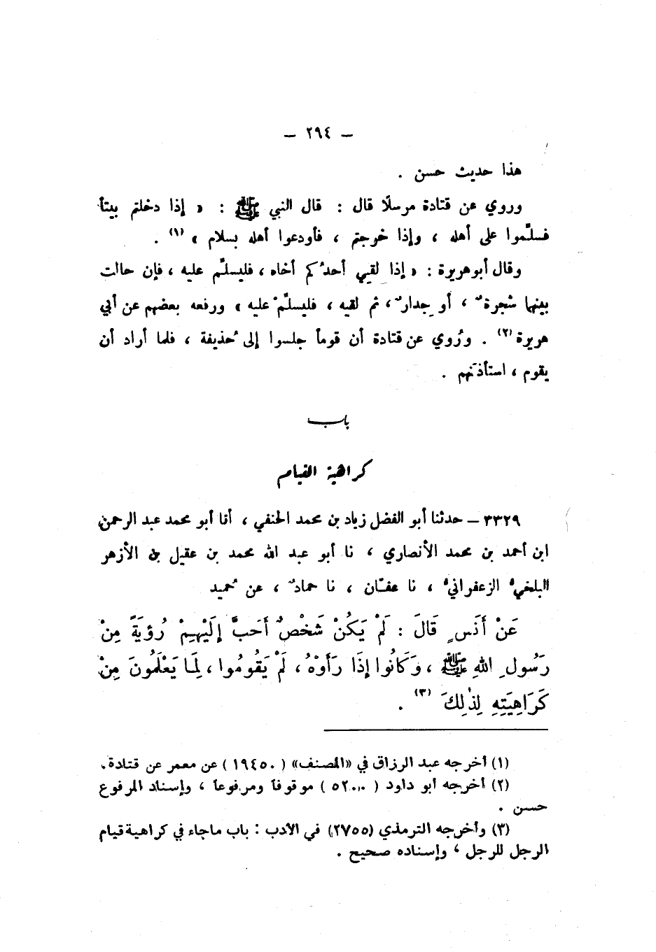 وَرُوِيَ عَنْ قَتَادَةَ، مُرْسَلا، قَالَ: قَالَ النَّبِيّ صَلَّى اللهُ عَلَيْهِ وَسَلَّمَ: «إِذَا دَخَلْتُمْ بَيْتًا فَسَلِّمُوا عَلَى أَهْلِهِ، وَإِذَا خَرَجْتُمْ، فَأوْدِعُوا أَهْلَهُ بِسَلامٍ».