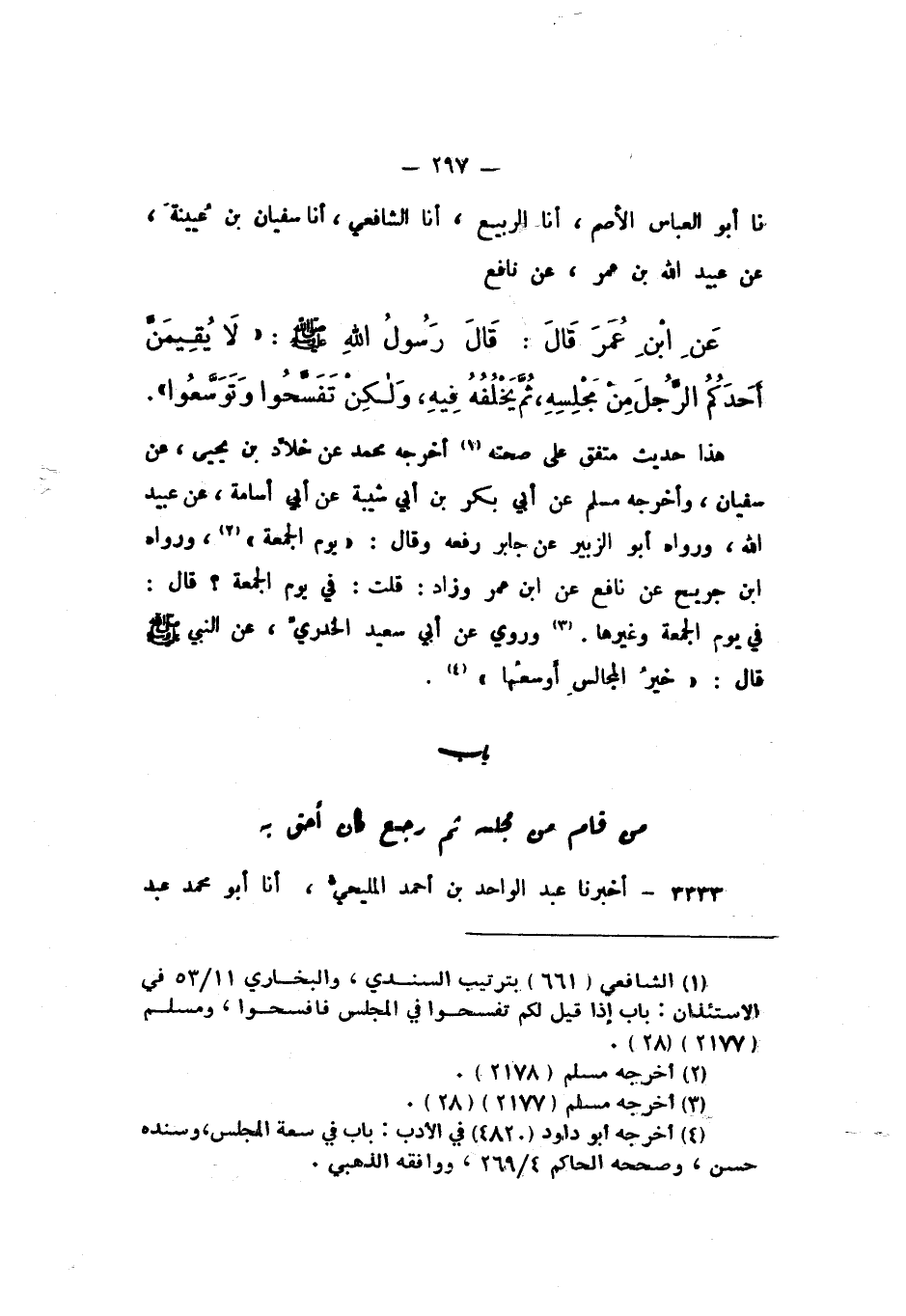 نَا أَبُو الْعَبَّاسِ الأَصَمُّ، أَنا الرَّبِيعُ، أَنا الشَّافِعِيُّ، أَنا سُفْيَانُ بْنُ عُيَيْنَةَ، عَنْ عُبَيْدِ اللَّهِ بْنِ عُمَرَ، عَنْ نَافِعٍ، عَنِ ابْنِ عُمَرَ، قَالَ: قَالَ رَسُولُ اللَّهِ صَلَّى اللهُ عَلَيْهِ وَسَلَّمَ: «لَا يُقِيمَنَّ أَحَدُكُمُ الرَّجُلَ مِنْ مَجْلِسِهِ، ثُمَّ يَخْلُفُهُ فِيهِ، وَلَكِنْ تَفَسَّحُوا وَتَوَسَّعُوا».