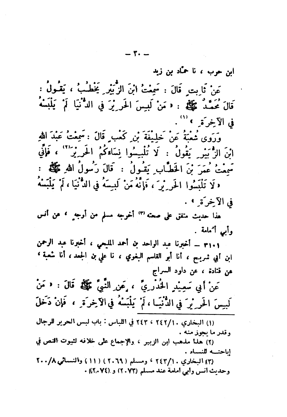 بْنُ حَرْبٍ، نَا حَمَّادُ بْنُ زَيْدٍ، عَنْ ثَابِتٍ، قَالَ: سَمِعْتُ ابْنَ الزُّبَيْرِ يَخْطُبُ، يَقُولُ: قَالَ مُحَمَّدٌ صَلَّى اللهُ عَلَيْهِ وَسَلَّمَ: «مَنْ لَبِسَ الْحَرِيرَ فِي الدُّنْيَا لَمْ يَلْبَسْهُ فِي الآخِرَةِ».