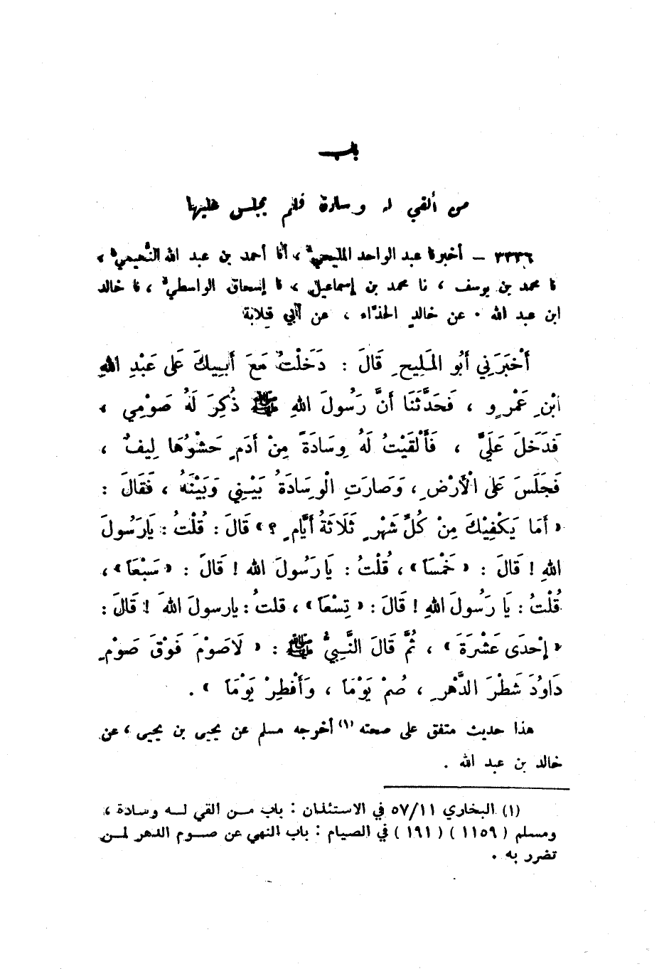 3336 - أَخْبَرَنَا عَبْدُ الْوَاحِدِ الْمَلِيحِيُّ، أَنا أَحْمَدُ بْنُ عَبْدِ اللَّهِ النُّعَيْمِيُّ، نَا مُحَمَّدُ بْنُ يُوسُفَ، نَا مُحَمَّدُ بْنُ إِسْمَاعِيلَ، نَا إِسْحَاقُ الْوَاسِطِيُّ، نَا خَالِدُ بْنُ عَبْدِ اللَّهِ، عَنْ خَالِدٍ الْحَذَّاءِ، عَنْ أَبِي قُلابَةَ، أَخْبَرَنِي أَبُو الْمَلِيحِ، قَالَ: دَخَلْتُ مَعَ أَبِيكَ عَلَى عَبْدِ اللَّهِ بْنِ عَمْرٍو، فحدَّثَنَا " أَنَّ رَسُولَ اللَّهِ صَلَّى اللهُ عَلَيْهِ وَسَلَّمَ ذُكِرَ لَهُ صَوْمِي، فَدَخَلَ عَلَيَّ، فَأَلْقَيْتُ لَهُ وِسَادَةً مِنْ أَدَمٍ حَشْوُهَا لِيفٌ، فَجَلَسَ عَلَى الأَرْضِ، وَصَارَتِ الْوِسَادَةُ بَيْنِي وَبَيْنَهُ، فَقَالَ: أَمَا يَكْفِيكَ مِنْ كُلِّ شَهْرٍ ثَلاثَةُ أَيَّامٍ؟ قَالَ: قُلْتُ: يَا رَسُولَ اللَّهِ.