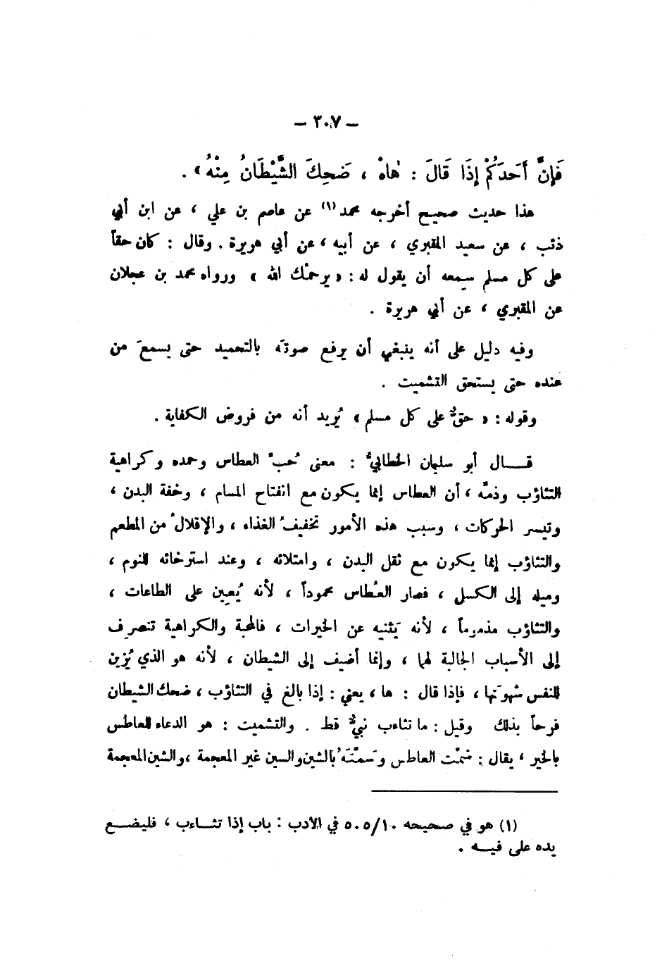 قَالَ أَبُو سُلَيْمَان الْخطابِيّ: معنى حب العطاس وحمده وكراهية التثاؤب وذمه، أَن العطاس إِنَّمَا يكون مَعَ انفتاح المسام، وخفة الْبدن، وتيسر الحركات، وَسبب هَذِه الْأُمُور تَخْفيف الْغذَاء، والإقلال مِن الْمطعم، والتثاؤب إِنَّمَا يكون مَعَ ثقل الْبدن، وامتلائه، وَعند استرخائه للنوم، وميله إِلَى الكسل، فَصَارَ العطاس مَحْمُودًا، لِأَنَّهُ يعين عَلَى الطَّاعَات، والتثاؤب مذموما، لِأَنَّهُ يثنيه عَن الْخيرَات، فالمحبة والكراهية تَنْصَرِف إِلَى الْأَسْبَاب الجالبة لَهما، وَإِنَّمَا أضيف إِلَى الشَّيْطَان، لِأَنَّهُ هُوَ الَّذِي يزين للنَّفس شهوتها، فَإِذا قَالَ: هَا، يَعْنِي: إِذا بَالغ فِي التثاؤب، ضحك الشَّيْطَان فَرحا بذلك، وَقيل: «مَا تثاءب نَبِي قطّ».