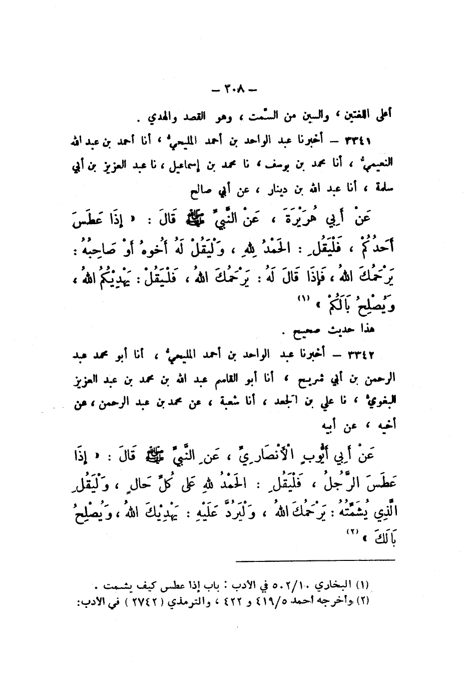 3341 - أَخْبَرَنَا عَبْدُ الْوَاحِدِ بْنُ أَحْمَدَ الْمَلِيحِيُّ، أَنا أَحْمَدُ بْنُ عَبْدِ اللَّهِ النُّعَيْمِيُّ، أَنا مُحَمَّدُ بْنُ يُوسُفَ، نَا مُحَمَّدُ بْنُ إِسْمَاعِيلَ، نَا عَبْدُ الْعَزِيزِ بْنُ أَبِي سَلَمَةَ، أَنا عَبْدُ اللَّهِ بْنُ دِينَارٍ، عَنْ أَبِي صَالِحٍ، عَنْ أَبيِ هُرَيْرَةَ، عَنِ النَّبِيِّ صَلَّى اللهُ عَلَيْهِ وَسَلَّمَ، قَالَ: " إِذَا عَطَسَ أَحَدُكُمْ، فَلْيَقُلِ: الْحَمْدُ لِلَّهِ، وَلْيَقُلْ لَهُ أَخُوهُ أَوْ صَاحِبُهُ: يَرْحَمُكَ اللَّهُ، فَإِذَا قَالَ لَهُ: يَرْحَمُكَ اللَّهُ، فَلْيَقُلْ: يَهْدِيكُمُ اللَّهُ، وَيُصْلِحُ بَالَكُمْ ".