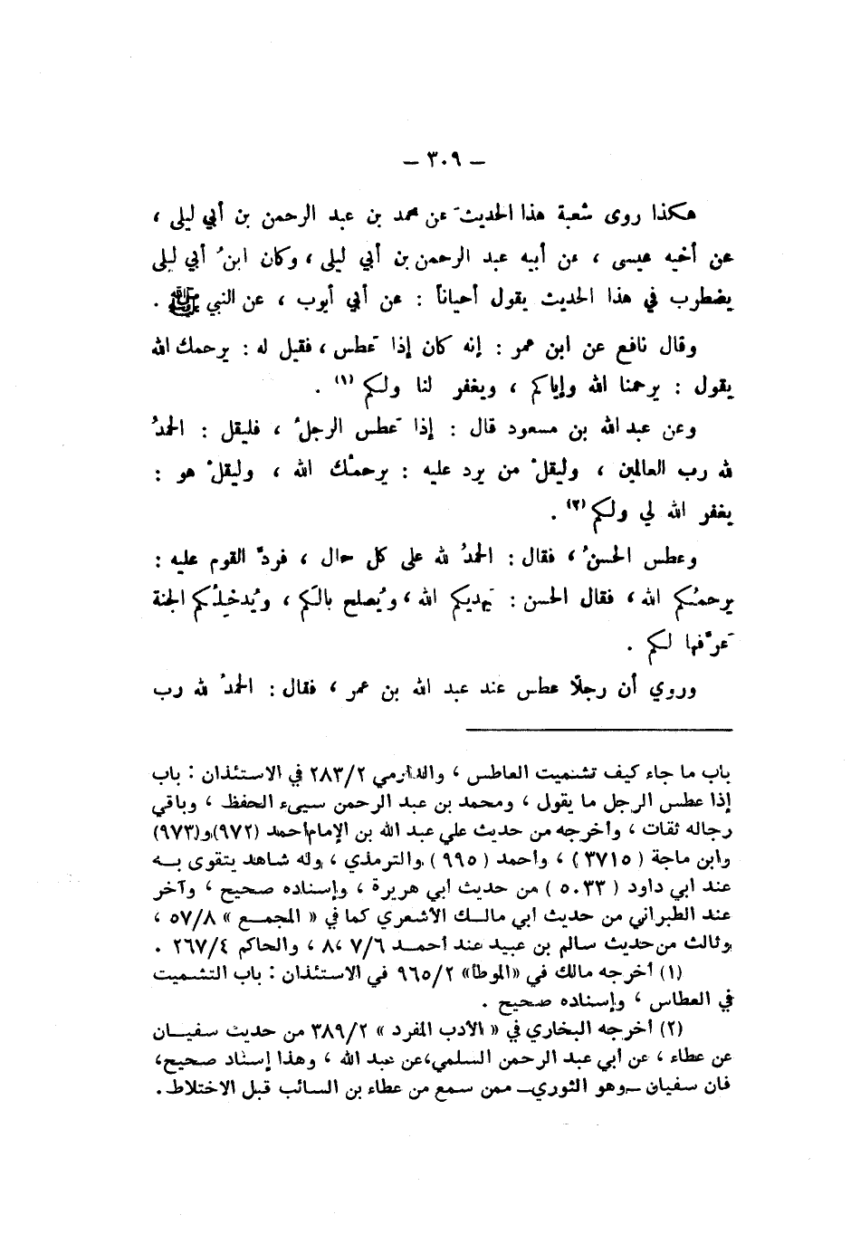 وَرُوِيَ أَن رجلا عطس عِنْد عَبْد اللَّه بْن عُمَر، فَقَالَ: الْحَمد لله رب