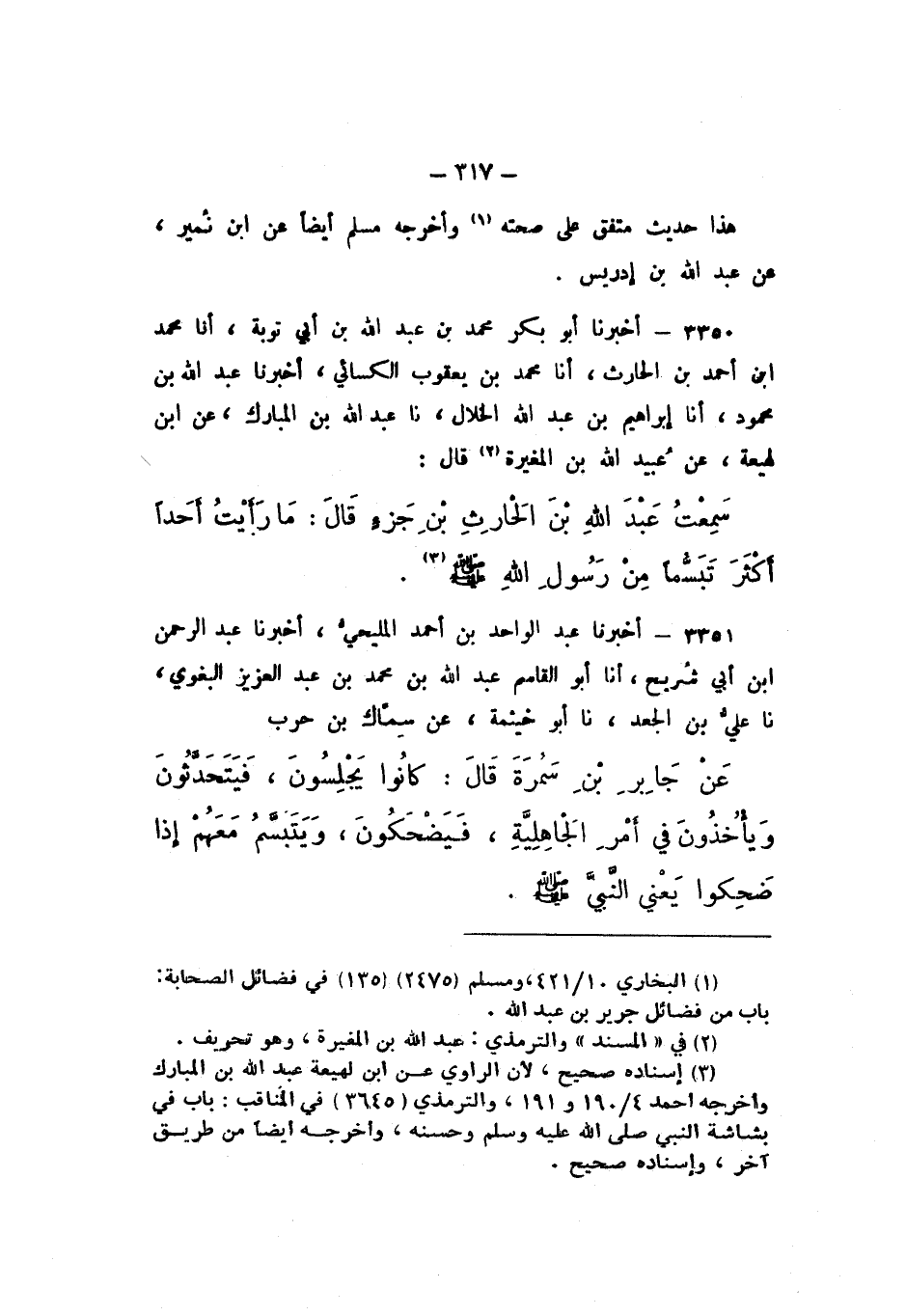 3350 - أَخْبَرَنَا أَبُو بَكْرٍ مُحَمَّدُ بْنُ عَبْدِ اللَّهِ بْنِ أَبِي تَوْبَةَ، أَنا مُحَمَّدُ بْنُ أَحْمَدَ بْنِ الْحَارِثِ، أَنا مُحَمَّدُ بْنُ يَعْقُوبَ الْكِسَائِيُّ، أَخْبَرَنَا عَبْدُ اللَّهِ بْنُ مَحْمُودٍ، أَنا إِبْرَاهِيمُ بْنُ عَبْدِ اللَّهِ الْخَلالُ، نَا عَبْدُ اللَّهِ بْنُ الْمُبَارَكِ، عَنِ ابْنِ لَهِيعَةَ، عَنْ عُبَيْدِ اللَّهِ بْنِ الْمُغِيرَةِ، قَالَ: سَمِعْتُ عَبْدَ اللَّهِ بْنَ الْحَارِثِ بْنِ جَزْءٍ، قَالَ: مَا رَأَيْتُ أَحَدًا أَكْثَرَ تَبَسُّمًا مِنْ رَسُولِ اللَّهِ صَلَّى اللهُ عَلَيْهِ وَسَلَّمَ "