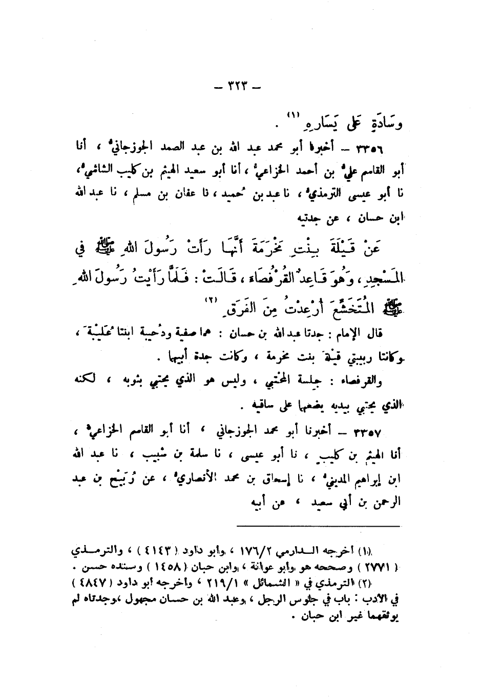 3356 - أَخْبَرَنَا أَبُو مُحَمَّدٍ عَبْدُ اللَّهِ بْنُ عَبْدِ الصَّمَدِ الْجَوْزَجَانِيُّ، أَنا أَبُو الْقَاسِمِ عَلِيُّ بْنُ أَحْمَدَ الْخُزَاعِيُّ، أَنا أَبُو سَعِيدٍ الْهَيْثَمُ بْنُ كُلَيْبٍ الشَّاشِيُّ، نَا أَبُو عِيسَى التِّرْمِذِيُّ، نَا عَبْدُ بْنُ حُمَيْدٍ، نَا عَفَّانُ بْنُ مُسْلِمٍ، نَا عَبْدُ اللَّهِ بْنُ حَسَّانٍ، عَنْ جَدَّتَيْهِ، عَنْ قَيْلَةَ بِنْتِ مَخْرَمَةَ، " أَنَّهَا رَأَتْ رَسُولَ اللَّهِ صَلَّى اللهُ عَلَيْهِ وَسَلَّمَ فِي الْمَسْجِدِ، وَهُوَ قَاعِدٌ الْقُرْفُصَاءَ، قَالَتْ: فَلَمَّا رَأَيْتُ رَسُولَ اللَّهِ صَلَّى اللهُ عَلَيْهِ وَسَلَّمَ الْمُتَخَشِّعَ أُرْعِدْتُ مِنَ الْفَرَقِ "