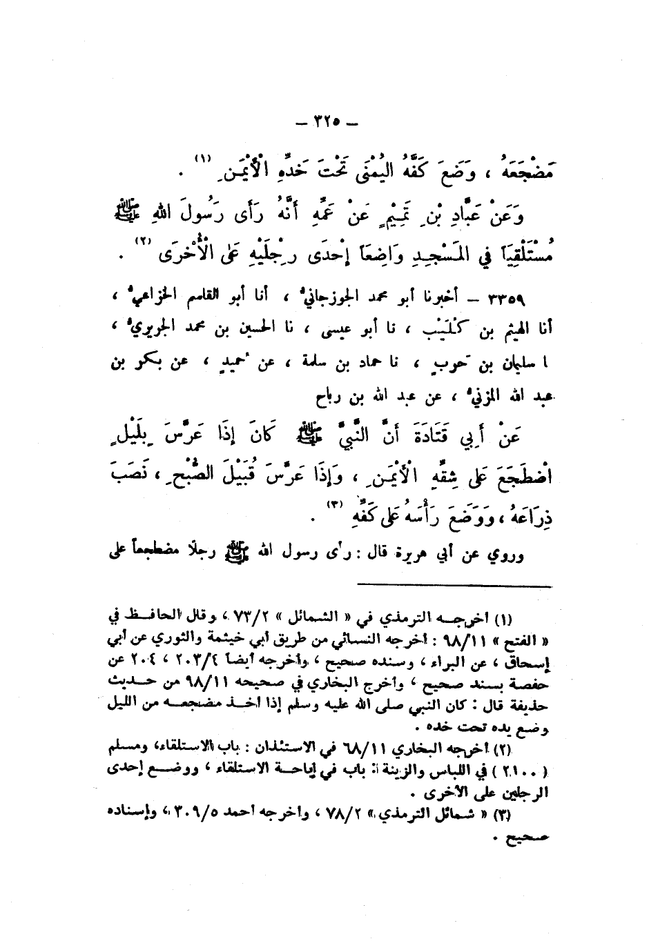 3359 - أَخْبَرَنَا أَبُو مُحَمَّدٍ الْجَوْزَجَانِيُّ، أَنا أَبُو الْقَاسِمِ الْخُزَاعِيُّ، أَنا الْهَيْثَمُ بْنُ كُلَيْبٍ، نَا أَبُو عِيسَى، نَا الْحُسَيْنُ بْنُ مُحَمَّدٍ الْجَرِيرِيُّ، نَا سُلَيْمَانُ بْنُ حَرْبٍ، نَا حَمَّادُ بْنُ سَلَمَةَ، عَنْ حُمَيْدٍ، عَنْ بَكْرِ بْنِ عَبْدِ اللَّهِ الْمُزَنِيُّ، عَنْ عَبْدِ اللَّهِ بْنِ رَبَاحٍ، عَنْ أَبِي قَتَادَةَ، «أَنَّ النَّبِيَّ صَلَّى اللهُ عَلَيْهِ وَسَلَّمَ كَانَ إِذَا عَرَّسَ بِلَيْلٍ اضْطَجَعَ عَلَى شِقِّهِ الأَيْمَنِ، وَإِذَا عَرَّسَ قُبَيْلَ الصُّبْحِ، نَصَبَ ذِرَاعَهُ، وَوَضَعَ رَأْسَهُ عَلَى كَفِّهِ»