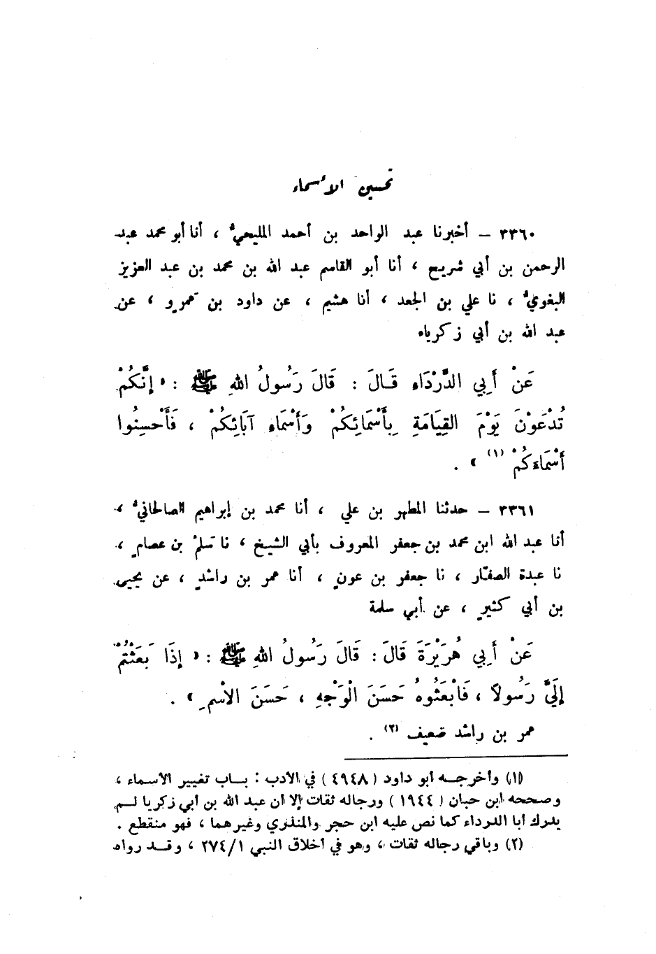 3360 - أَخْبَرَنَا عَبْدُ الْوَاحِدِ بْنُ أَحْمَدَ الْمَلِيحِيُّ، أَنا أَبُو مُحَمَّدٍ عَبْدُ الرَّحْمَنِ بْنُ أَبِي شُرَيْحٍ، أَنا أَبُو الْقَاسِمِ عَبْدُ اللَّهِ بْنُ مُحَمَّدِ بْنِ عَبْدِ الْعَزِيزِ الْبَغَوِيُّ، نَا عَلِيُّ بْنُ الْجَعْدِ، أَنا هُشَيْمٌ، عَنْ دَاوُدَ بْنِ عَمْرٍو، عَنْ عَبْدِ اللَّهِ بْنِ أَبِي زَكَرِيَّاءَ، عَنْ أَبِي الدَّرْدَاءِ، قَالَ: قَالَ رَسُولُ اللَّهِ صَلَّى اللهُ عَلَيْهِ وَسَلَّمَ: «إِنَّكُمْ تُدْعَوْنَ يَوْمَ الْقِيَامَةِ بِأَسْمَائِكُمْ وَأَسْمَاءِ آبَائِكُمْ، فَأَحْسِنُوا أَسْمَاءَكُمْ»