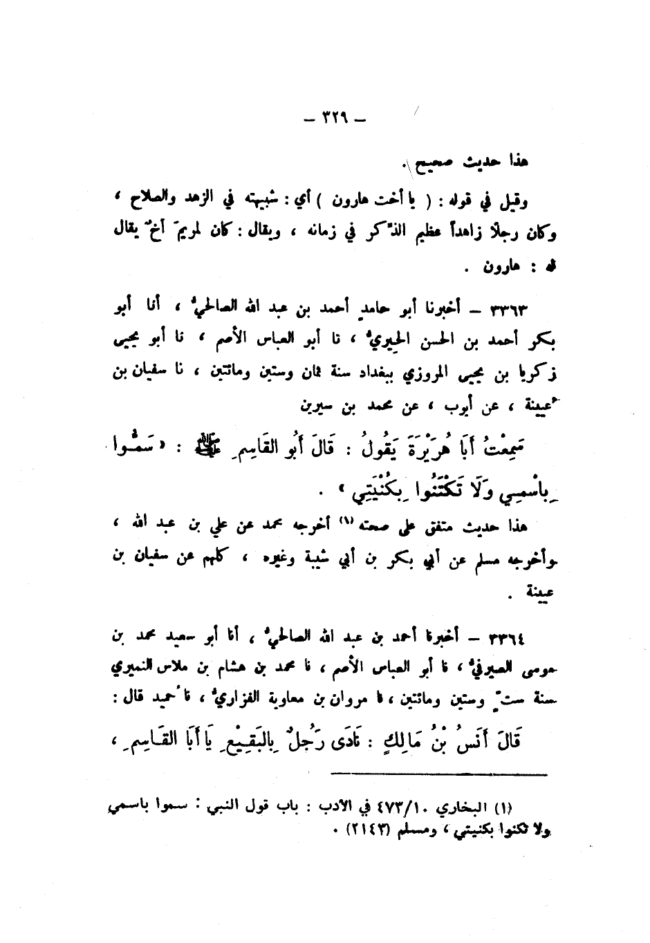 3363 - أَخْبَرَنَا أَبُو حَامِدٍ أَحْمَدُ بْنُ عَبْدِ اللَّهِ الصَّالِحِيُّ، أَنا أَبُو بَكْرٍ أَحْمَدُ بْنُ الْحَسَنِ الْحِيرِيُّ، نَا أَبُو الْعَبَّاسِ الأَصَمُّ، نَا أَبُو يَحْيَى زَكَرِيَّا بْنُ يَحْيَى الْمَرْوَزِيُّ، بِبَغْدَادَ سَنَةَ ثَمَانٍ وَسِتِّينَ وَمِائَتَيْنِ، نَا سُفْيَانُ بْنُ عُيَيْنَةَ، عَنْ أَيُّوبَ، عَنْ مُحَمَّدِ بْنِ سِيرِينَ، سَمِعْتُ أَبَا هُرَيْرَةَ، يَقُولُ: قَالَ أَبُو الْقَاسِمِ صَلَّى اللهُ عَلَيْهِ وَسَلَّمَ: «سَمُّوا بِاسْمِي وَلا تكتنوا بِكُنْيَتِي».