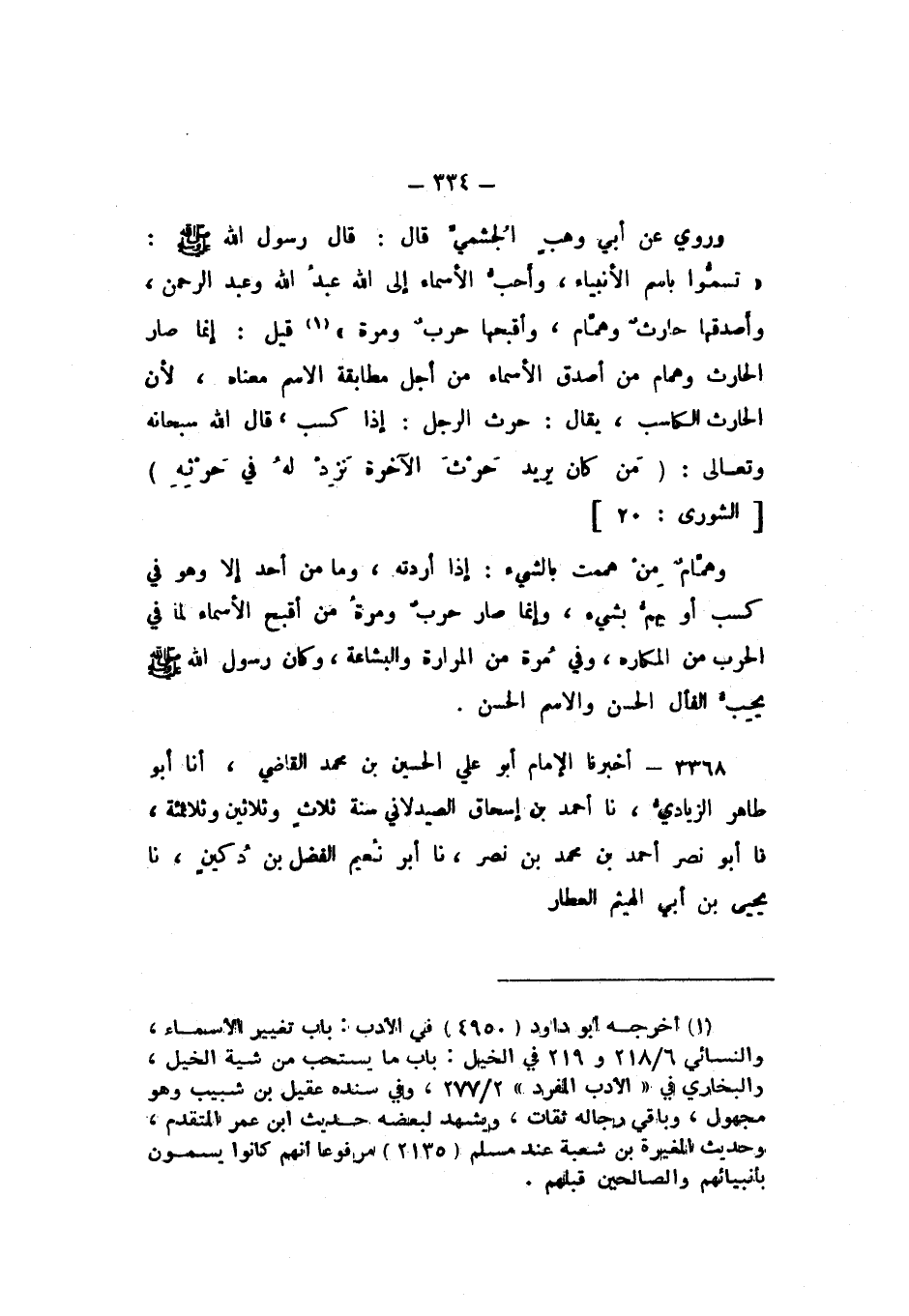 وَرُوِيَ عَنْ أَبِي وَهْبٍ الْجُشَمِيِّ، قَالَ: قَالَ رَسُولُ اللَّهِ صَلَّى اللهُ عَلَيْهِ وَسَلَّمَ: «تَسَمَّوْا بِاسْمِ الأَنْبِيَاءِ، وَأَحَبُّ الأَسْمَاءِ إِلَى اللَّهِ عَبْدُ اللَّهِ وَعَبْدُ الرَّحْمَنِ، وَأَصْدَقُهَا حَارِثٌ وَهَمَّامٌ، وَأَقْبَحُهَا حَرْبٌ وَمُرَّةُ».