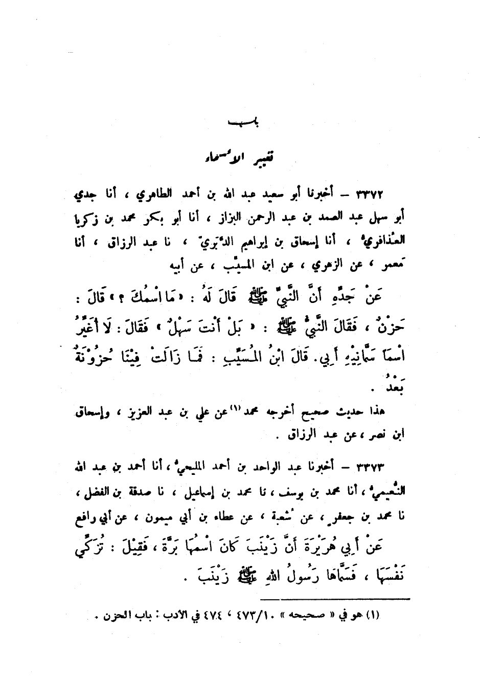 3372 - أَخْبَرَنَا أَبُو سَعِيدٍ عَبْدُ اللَّهِ بْنُ أَحْمَدَ الطَّاهِرِيُّ، أَنا جَدِّي أَبُو سَهْلٍ عَبْدُ الصَّمَدِ بْنُ عَبْدِ الرَّحْمَنِ الْبَزَّازُ، أَنا أَبُو بَكْرٍ مُحَمَّدُ بْنُ زَكَرِيَّا الْعَذَافِرِيُّ، أَنا إِسْحَاقُ بْنُ إِبْرَاهِيمَ الدَّبَرِيُّ، نَا عَبْدُ الرَّزَّاقِ، أَنا مَعْمَرٌ، عَنِ الزُّهْرِيِّ، عَنِ ابْنِ الْمُسَيِّبِ، عَنْ أَبِيهِ، عَنْ جَدِّهِ، أَنّ النَّبِيَّ صَلَّى اللهُ عَلَيْهِ وَسَلَّمَ، قَالَ لَهُ: «مَا اسْمُكَ؟» قَالَ: حَزْنٌ، فَقَالَ النَّبِيُّ صَلَّى اللهُ عَلَيْهِ وَسَلَّمَ: بَلْ أَنْتَ سَهْلٌ "، فَقَالَ: لَا أُغَيِّرُ اسْمًا سَمَّانِيهِ أَبِي ".