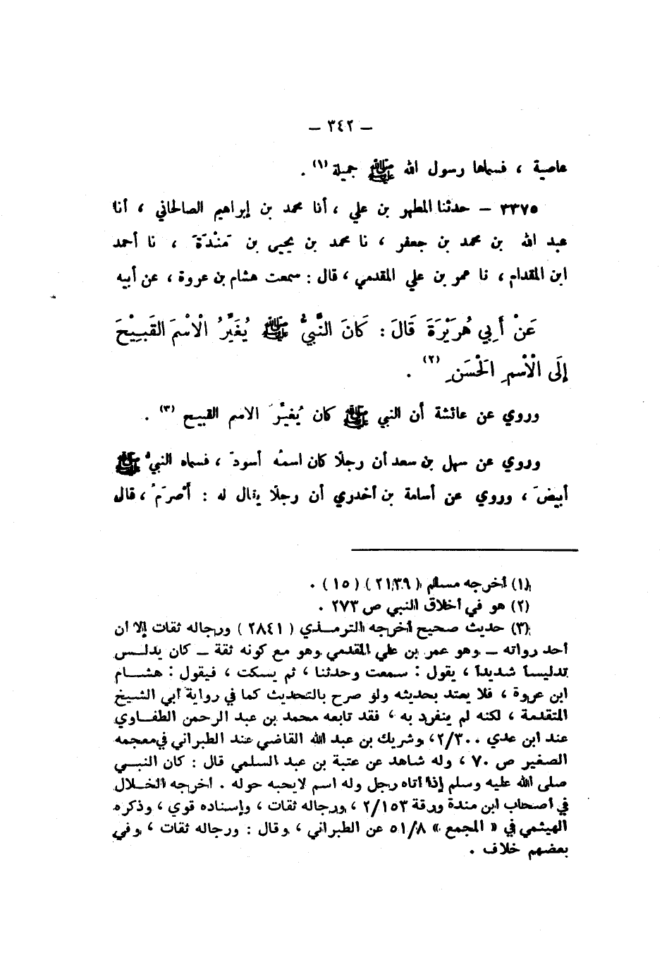 3375 - حَدَّثَنَا الْمُطَهَّرُ بْنُ عَلِيٍّ، أَنا مُحَمَّدُ بْنُ إِبْرَاهِيمَ الصَّالْحَانِيُّ، أَنا عَبْدُ اللَّهِ بْنُ مُحَمَّدِ بْنِ جَعْفَرٍ، نَا مُحَمَّدُ بْنُ يَحْيَى بْنِ مَنْدَهْ، نَا أَحْمَدُ بْنُ الْمِقْدَامِ، نَا عُمَرُ بْنُ عَلِيٍّ الْمُقَدَّمِيُّ، قَالَ: سَمِعْتُ هِشَامَ بْنَ عُرْوَةَ، عَنْ أَبِيهِ، عَنْ أَبيِ هُرَيْرَةَ، قَالَ: «كَانَ النَّبِيُّ صَلَّى اللهُ عَلَيْهِ وَسَلَّمَ يُغَيِّرُ الاسْمَ الْقَبِيحَ إِلَى الاسْمِ الْحَسَنِ».