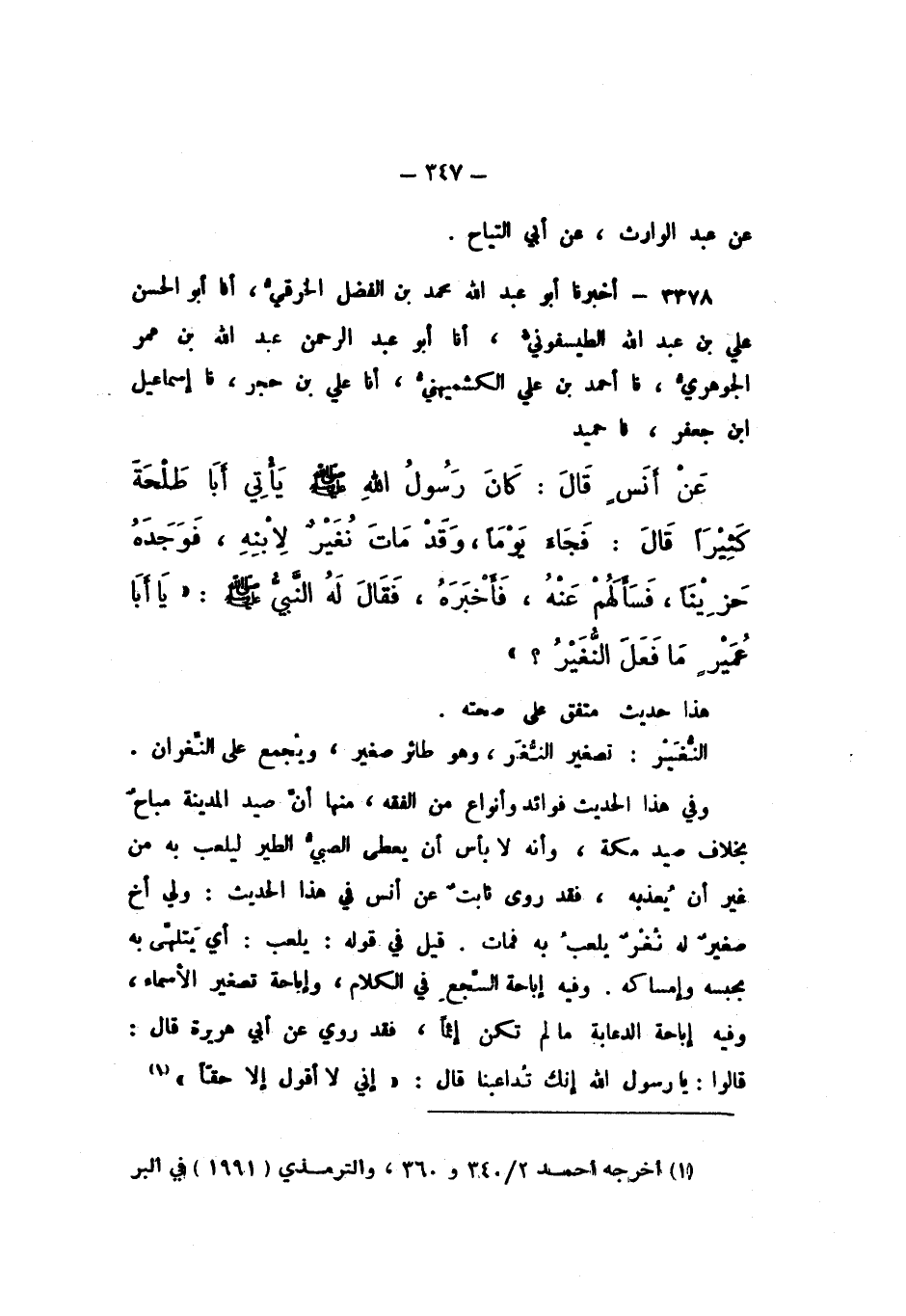3378 - أَخْبَرَنَا أَبُو عَبْدِ اللَّهِ مُحَمَّدُ بْنُ الْفَضْلِ الْخِرَقِيُّ، أَنا أَبُو الْحَسَنِ عَلِيُّ بْنُ عَبْدِ اللَّهِ الطَّيْسَفُونِيُّ، أَنا أَبُو عَبْدِ الرَّحْمَنِ عَبْدُ اللَّهِ بْنُ عُمَرَ الْجَوْهَرِيُّ، نَا أَحْمَدُ بْنُ عَلِيٍّ الْكُشْمِيهَنِيُّ، أَنا عَلِيُّ بْنُ حُجْرٍ، نَا إِسْمَاعِيلُ بْنُ جَعْفَرٍ، نَا حُمَيْدٌ، عَنْ أَنَسٍ، قَالَ: كَانَ رَسُولُ اللَّهِ صَلَّى اللهُ عَلَيْهِ وَسَلَّمَ يَأْتِي أَبَا طَلْحَةَ كَثِيرًا، قَالَ: فَجَاءَ يَوْمًا، وَقَدْ مَاتَ نُغَيْرٌ لابْنِهِ، فَوَجَدَهُ حَزِينًا، فَسَأَلَهُمْ عَنْهُ، فَأَخْبَرَهُ، فَقَالَ لَهُ النَّبِيُّ صَلَّى اللهُ عَلَيْهِ وَسَلَّمَ: «يَا أَبَا عُمَيْرٍ مَا فَعَلَ النُّغَيْرُ؟» هَذَا حَدِيثٌ مُتَّفَقٌ عَلَى صِحَّتِهِ
