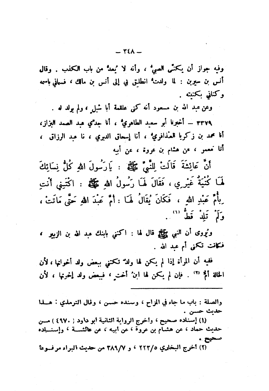 3379 - أَخْبَرَنَا أَبُو سَعِيدٍ الطَّاهِرِيُّ، أَنا جَدِّي عَبْدُ الصَّمَدِ الْبَزَّازُ، أَنا مُحَمَّدُ بْنُ زَكَرِيَّا الْعَذَافِرِيُّ، أَنا إِسْحَاقُ الدَّبَرِيُّ، نَا عَبْدُ الرَّزَّاقِ، أَنا مَعْمَرٌ، عَنْ هِشَامِ بْنِ عُرْوَةَ، عَنْ أَبِيهِ، أَنَّ عَائِشَةَ قَالَتْ لِلنَّبِيِّ صَلَّى اللهُ عَلَيْهِ وَسَلَّمَ: " يَا رَسُولَ اللَّهِ، كُلُّ نِسَائِكَ لَهَا كُنْيَةٌ غَيْرِي، فَقَالَ لَهَا رَسُولُ اللَّهِ صَلَّى اللهُ عَلَيْهِ وَسَلَّمَ: " اكْتَنِي أَنْتِ بِأُمِّ عَبْدِ اللَّهِ، فَكَانَ يُقَالُ لَهَا: أُمُّ عَبْدِ اللَّهِ حَتَّى مَاتَتْ، وَلَمْ تَلِدْ قَطُّ ".