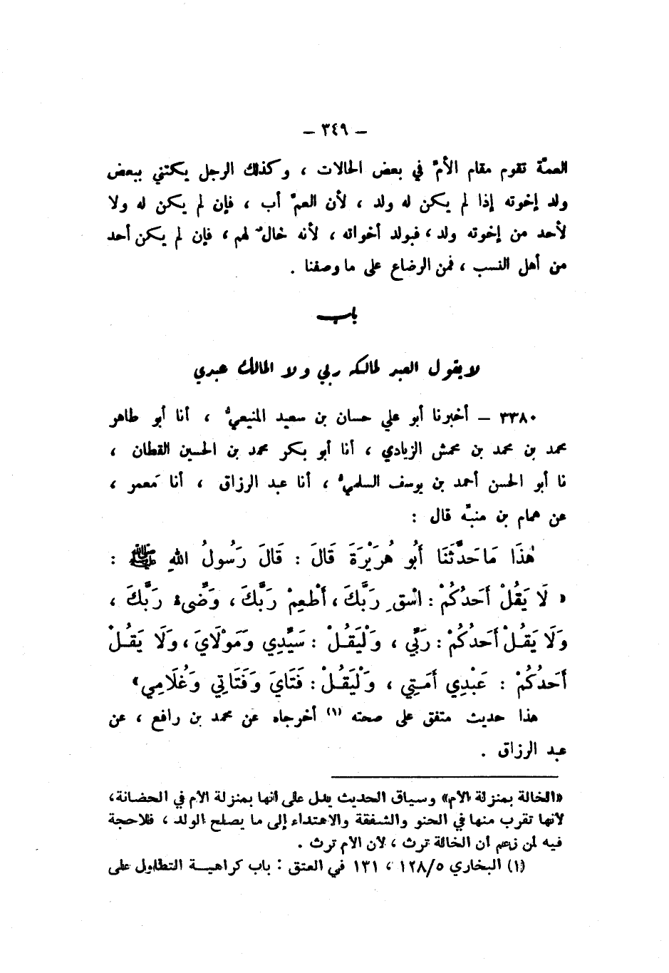 3380 - أَخْبَرَنَا أَبُو عَلِيٍّ حَسَّانُ بْنُ سَعِيدٍ الْمَنِيعِيُّ، أَنا أَبُو طَاهِرٍ مُحَمَّدُ بْنُ مُحَمَّدِ بْنِ مَحْمِشٍ الزِّيَادِيُّ، أَنا أَبُو بَكْرٍ مُحَمَّدُ بْنُ الْحُسَيْنِ الْقَطَّانُ، نَا أَبُو الْحَسَنِ أَحْمَدُ بْنُ يُوسُفَ السُّلَمِيُّ، أَنا عَبْدُ الرَّزَّاقِ، أَنا مَعْمَرٌ، عَنْ هَمَّامِ بْنِ مُنَبِّهٍ، قَالَ: هذَا مَا حَدَّثَنَا أَبُو هُرَيْرَةَ، قَالَ: قَالَ رَسُولُ اللَّهِ صَلَّى اللهُ عَلَيْهِ وَسَلَّمَ: " لَا يَقُلْ أَحَدُكُمُ: اسْقِ رَبَّكَ، أَطْعِمْ رَبَّكَ، وَضِّئْ رَبَّكَ، وَلا يَقُلْ أَحَدُكُمْ: رَبِّي، وَلْيَقُلْ: سَيِّدِي وَمَوْلايَ، وَلا يَقُلْ أَحَدُكُمْ: عَبْدِي، أَمَتِي، وَلْيَقُلْ: فَتَايَ، وَفَتَاتِي، وَغُلامِي ".