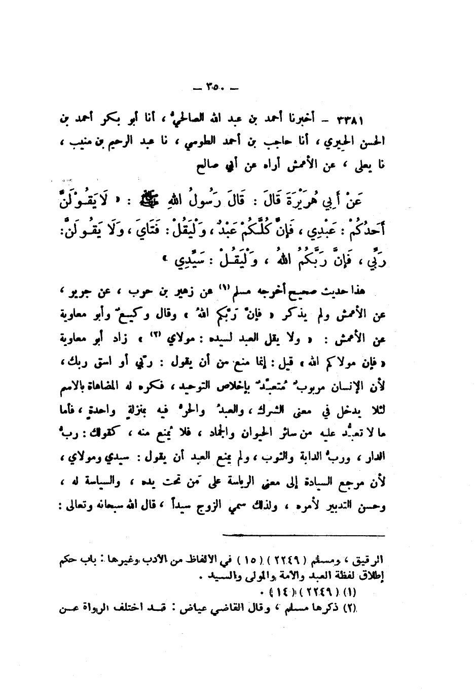 3381 - أَخْبَرَنَا أَحْمَدُ بْنُ عَبْدِ اللَّهِ الصَّالِحِيُّ، أَنا أَبُو بَكْرٍ أَحْمَدُ بْنُ الْحَسَنِ الْحِيرِيُّ، أَنا حَاجِبُ بْنُ أَحْمَدَ الطُّوسِيُّ، نَا عَبْدُ الرَّحِيمِ بْنُ مُنِيبٍ، نَا يَعْلَى، عَنِ الأَعْمَشِ، أَرَاهُ عَنْ أَبِي صَالِحٍ، عَنْ أَبيِ هُرَيْرَةَ، قَال: قَالَ رَسُولُ اللَّهِ صَلَّى اللهُ عَلَيْهِ وَسَلَّمَ: " لَا يَقُولَنَّ أَحَدُكُمْ: عَبْدِي، فَإنَّ كُلَّكُمْ عَبْدٌ، وَلْيَقُلْ: فَتَايَ، وَلا يَقُولَنَّ: رَبِّي، فَإِنَّ رَبَّكُمُ اللَّهُ، وَلْيَقُلْ: سَيِّدِي «.