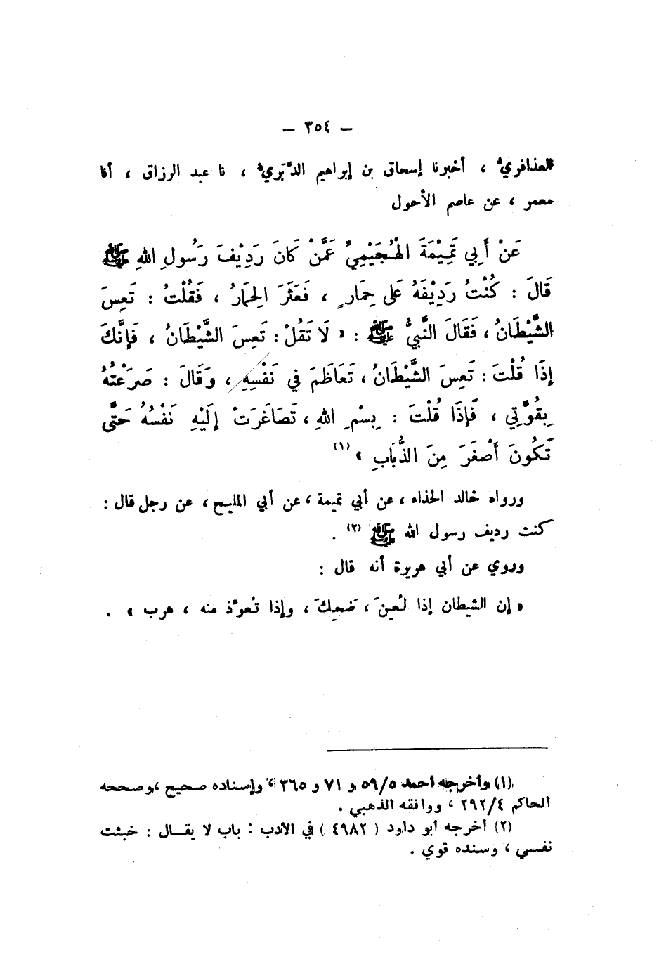 الْعَذَافِرِيُّ، أَخْبَرَنَا إِسْحَاقُ بْنُ إِبْرَاهِيمَ الدَّبَرِيُّ، نَا عَبْدُ الرَّزَّاقِ، أَنا مَعْمَرٌ، عَنْ عَاصِمٍ الأَحْوَلِ، عَنْ أَبِي تَمِيمَةَ الْهُجَيْمِيِّ، عَمَّنْ كَانَ رَدِيفَ رَسُولِ اللَّهِ صَلَّى اللهُ عَلَيْهِ وَسَلَّمَ، قَالَ: " كُنْتُ رَدِيفَهُ عَلَى حِمَارٍ، فَعَثَرَ الْحِمَارُ، فَقُلْتُ: تَعِسَ الشَّيْطَانُ، فَقَالَ النَّبِيُّ صَلَّى اللهُ عَلَيْهِ وَسَلَّمَ: " لَا تَقُلْ: تَعِسَ الشَّيْطَانُ، فَإِنَّكَ إِذَا قُلْتَ: تَعِسَ الشَّيْطَانُ، تَعَاظَمَ فِي نَفْسِهِ، وَقَالَ: صَرَعْتُهُ بِقُوَّتِي، فَإِذَا قُلْتَ: بِسْمِ اللَّهِ، تَصَاغَرَتْ إِلَيْهِ نَفْسُهُ حَتَّى تَكُونَ أَصْغَرَ مِنَ الذُّبَابِ ".