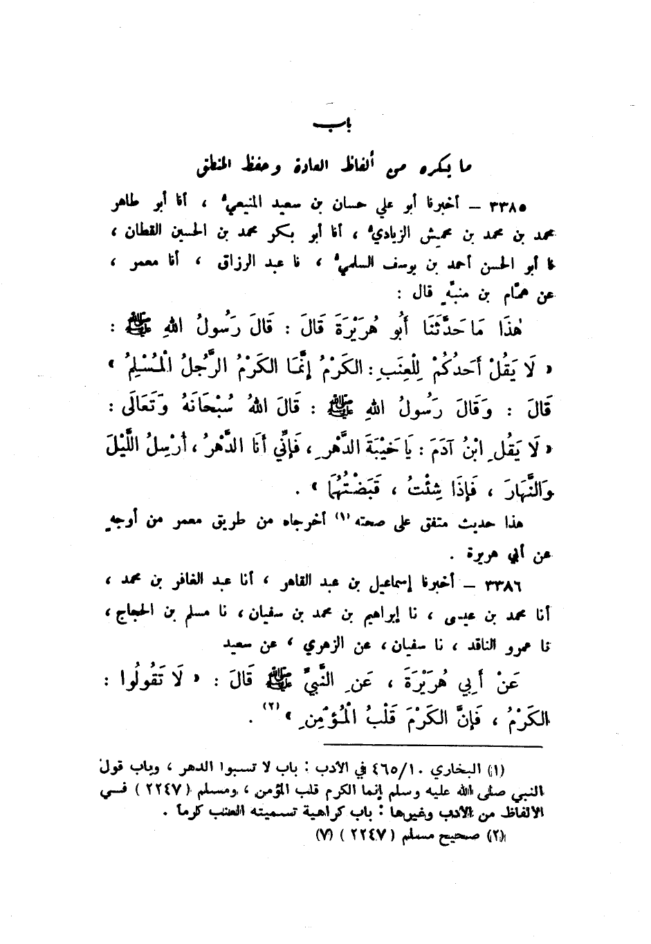3386 - أَخْبَرَنَا إِسْمَاعِيلُ بْنُ عَبْدِ الْقَاهِرِ، أَنا عَبْدُ الْغَافِرِ بْنُ مُحَمَّدٍ، أَنا مُحَمَّدُ بْنُ عِيسَى، نَا إِبْرَاهِيمُ بْنُ مُحَمَّدِ بْنِ سُفْيَانَ، نَا مُسْلِمُ بْنُ الْحَجَّاجِ، نَا عَمْرٌو النَّاقِدُ، نَا سُفْيَانُ، عَنِ الزُّهْرِيِّ، عَنْ سَعِيدٍ، عَنْ أَبيِ هُرَيْرَةَ، عَنِ النَّبِيِّ صَلَّى اللهُ عَلَيْهِ وَسَلَّمَ، قَالَ: " لَا تَقُولُوا: الْكَرْمَ، فَإِنَّ الْكَرْمَ قَلْبُ الْمُؤْمِنِ «.