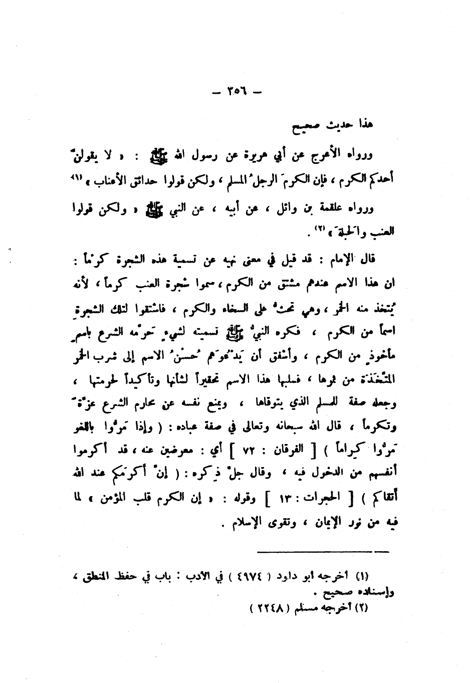 قَالَ الْإِمَام: قد قِيلَ فِي معنى نَهْيه عَن تَسْمِيَة هَذِه الشَّجَرَة كرما: أَن هَذَا الِاسْم عِنْدهم مُشْتَقّ مِن الْكَرم، سموا شَجَرَة الْعِنَب كرما، لِأَنَّهُ يتَّخذ مِنْهُ الْخمر، وَهِي تحث عَلَى السخاء وَالْكَرم، فاشتقوا لتِلْك الشَّجَرَة اسْما مِن الْكَرم، فكره النَّبِيّ صَلَّى اللهُ عَلَيْهِ وَسَلَّمَ تَسْمِيَته لشَيْء حرمه الشَّرْع باسم مَأْخُوذ مِن الْكَرم، وأشفق أَن يَدعُوهُم حَسَن الِاسْم إِلَى شرب الْخمر المتخذة مِن ثَمَرهَا، فسلبها هَذَا الِاسْم تحقيرا لشأنها وتأكيدا لحرمتها، وَجعله صفة للْمُسلمِ الَّذِي يتوقاها، وَيمْنَع نَفسه عَن محارم الشَّرْع عزة وتكرما، قَالَ اللَّهُ سُبْحَانَهُ وَتَعَالَى فِي صفة عباده: {وَإِذَا مَرُّوا بِاللَّغْوِ مَرُّوا كِرَامًا} [الْفرْقَان: 72]، أَي: معرضين عَنْهُ، قد أكْرمُوا أنفسهم مِن الدُّخُول فِيهِ، وَقَالَ جلّ ذكره: {إِنَّ أَكْرَمَكُمْ عِنْدَ اللَّهِ أَتْقَاكُمْ} [الحجرات: 13]، وَقَوله: «إِن الْكَرم قلب الْمُؤمن»، لما فِيهِ مِن نور الْإِيمَان، وتقوى الْإِسْلَام.