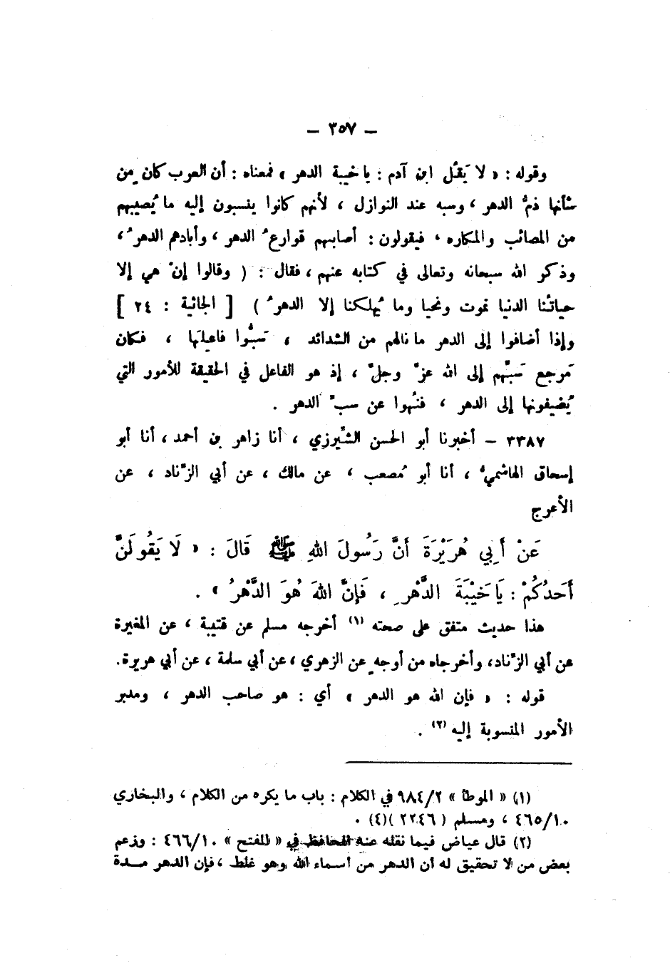 3387 - أَخْبَرَنَا أَبُو الْحَسَنِ الشِّيرَزِيُّ، أَنا زَاهِرُ بْنُ أَحْمَدَ، أَنا أَبُو إِسْحَاقَ الْهَاشِمِيُّ، أَنا أَبُو مُصْعَبٍ، عَنْ مَالِكٍ، عَنْ أَبِي الزِّنَادِ، عَنِ الأَعْرَجِ، عَنْ أَبيِ هُرَيْرَةَ، أَنّ رَسُولَ اللَّهِ صَلَّى اللهُ عَلَيْهِ وَسَلَّمَ، قَالَ: " لَا يَقُولَنَّ أَحَدُكُمْ: يَا خَيْبَةَ الدَّهْرِ، فَإِنَّ اللَّهَ هُوَ الدَّهْرُ ".