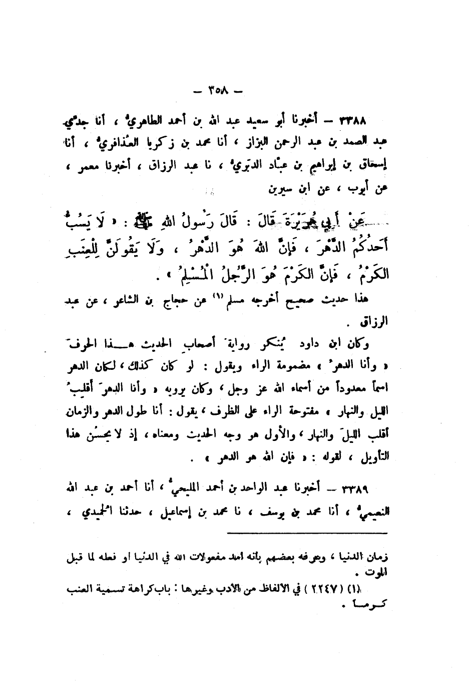3388 - أَخْبَرَنَا أَبُو سَعِيدٍ عَبْدُ اللَّهِ بْنُ أَحْمَدَ الطَّاهِرِيُّ، أَنا جَدِّي عَبْدُ الصَّمَدِ بْنُ عَبْدِ الرَّحْمَنِ الْبَزَّازُ، أَنا مُحَمَّدُ بْنُ زَكَرِيَّا الْعَذَافِرِيُّ، أَنا إِسْحَاقُ بْنُ إِبْرَاهِيمَ بْنِ عَبَّادٍ الدَّبَرِيُّ، نَا عَبْدُ الرَّزَّاقِ، أَخْبَرَنَا مَعْمَرٌ، عَنْ أَيُّوبَ، عَنِ ابْنِ سِيرِينَ، عَنْ أَبيِ هُرَيْرَةَ، قَالَ: قَالَ رَسُولُ اللَّهِ صَلَّى اللهُ عَلَيْهِ وَسَلَّمَ: «لَا يَسُبُّ أَحَدُكُمُ الدَّهْرَ، فَإِنَّ اللَّهَ هُوَ الدَّهْرُ، وَلا يَقُولَنَّ لِلْعِنَبِ الْكَرْمَ، فَإِنَّ الْكَرْمَ هُوَ الرَّجُلُ الْمُسْلِمُ».
