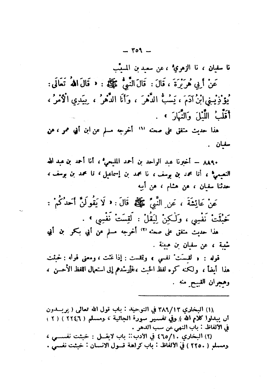 نَا سُفْيَانُ، نَا الزُّهْرِيُّ، عَنْ سَعِيدِ بْنِ الْمُسَيِّبِ، عَنْ أَبيِ هُرَيْرَةَ، قَالَ: قَالَ النَّبِيُّ صَلَّى اللهُ عَلَيْهِ وَسَلَّمَ: قَالَ اللَّهُ تَعَالَى: «يُؤْذِينِي ابْنُ آدَمَ، يَسُبُّ الدَّهْرَ، وَأَنَا الدَّهْرُ، بِيَدِي الأَمْرُ، أُقَلِّبُ اللَّيْلَ وَالنَّهَارَ».