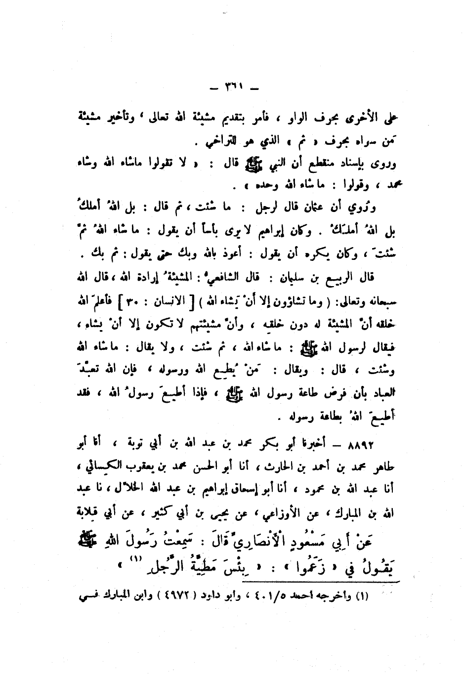عَلَى الْأُخْرَى بِحرف الْوَاو، فَأمر بِتَقْدِيم مَشِيئَة اللَّه تَعَالَى، وَتَأْخِير مَشِيئَة مِن سواهُ بِحرف» ثُمَّ " الَّذِي هُوَ للتراخي.