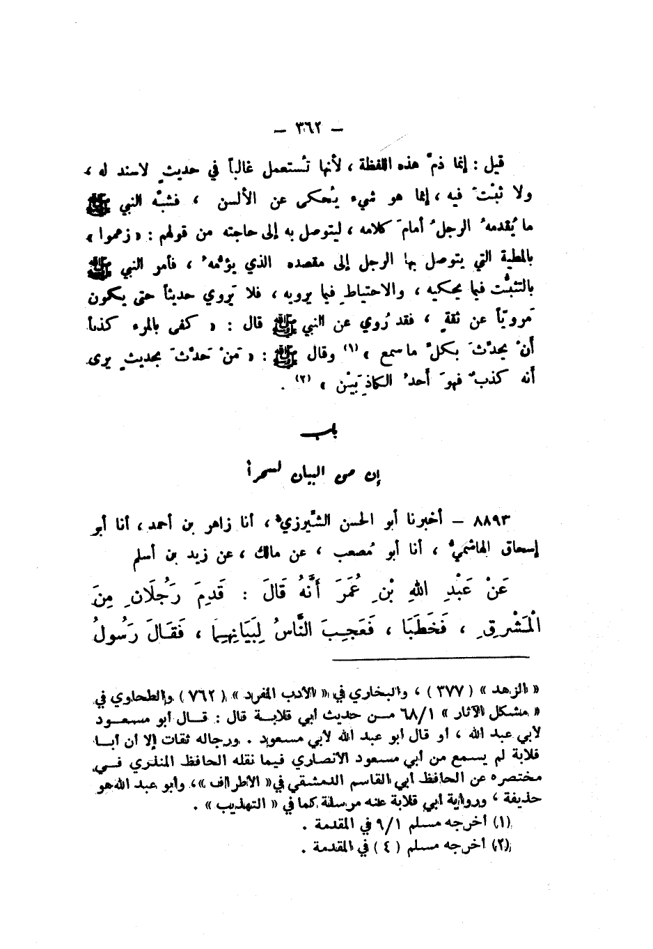 8893 - أَخْبَرَنَا أَبُو الْحَسَنِ الشِّيرَزِيُّ، أَنا زَاهِرُ بْنُ أَحْمَدَ، أَنا أَبُو إِسْحَاقَ الْهَاشِمِيُّ، أَنا أَبُو مُصْعَبٍ، عَنْ مَالِكٍ، عَنْ زَيْدِ بْنِ أَسْلَمَ، عَنْ عَبْدِ اللَّهِ بْنِ عُمَرَ، أَنَّهُ قَالَ: قَدِمَ رَجُلانِ مِنَ الْمَشْرِقِ، فَخَطَبَا، فَعَجِبَ النَّاسُ لِبَيَانِهِمَا، فَقَالَ رَسُولُ