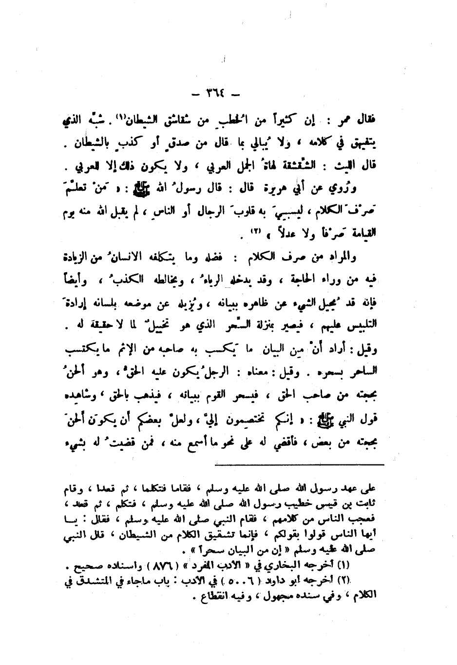 وَالْمرَاد مِن صرف الْكَلَام: فَضله وَمَا يتكلفه الْإِنْسَان مِن الزِّيَادَة فِيهِ مِن وَرَاء الْحَاجة، وَقد يدْخلهُ الرِّيَاء، ويخالطه الْكَذِب، وَأَيْضًا فَإِنَّهُ قد يحِيل الشَّيْء عَنْ ظَاهره ببيانه، ويزيله عَن مَوْضِعه بِلِسَانِهِ، إِرَادَة التلبيس عَلَيْهِم، فَيصير بِمَنْزِلَة السحر الَّذِي هُوَ تخييل لما لَا حَقِيقَة لَهُ.