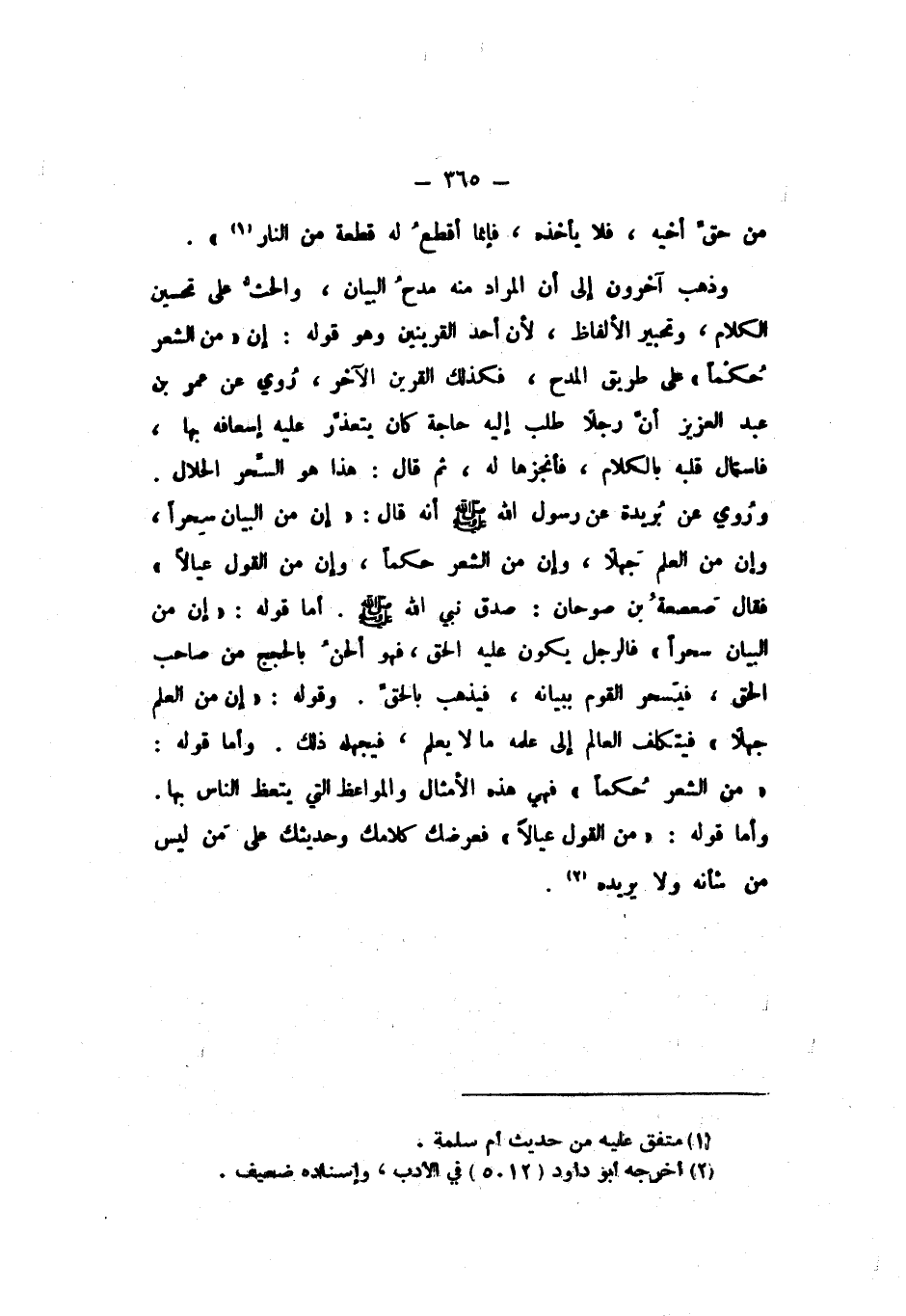 وَذهب آخَرُونَ إِلَى أَن المُرَاد مِنْهُ مدح الْبَيَان، والحث عَلَى تَحْسِين الْكَلَام، وتحبير الْأَلْفَاظ، لِأَن أحد القرينين، وَهُوَ قَوْله: «إِن مِن الشّعْر حكما»، عَلَى طَرِيق الْمَدْح، فَكَذَلِك القرين الآخر، رُوِيَ عَن عُمَر بْن عَبْد الْعَزِيز، أَن رجلا طلب إِلَيْهِ حَاجَة كَانَ يتَعَذَّر عَلَيْهِ إسعافه بهَا، فاستمال قلبه بالْكلَام، فأنجزها لَهُ، ثُمَّ قَالَ: هَذَا هُوَ السحر الْحَلَال.