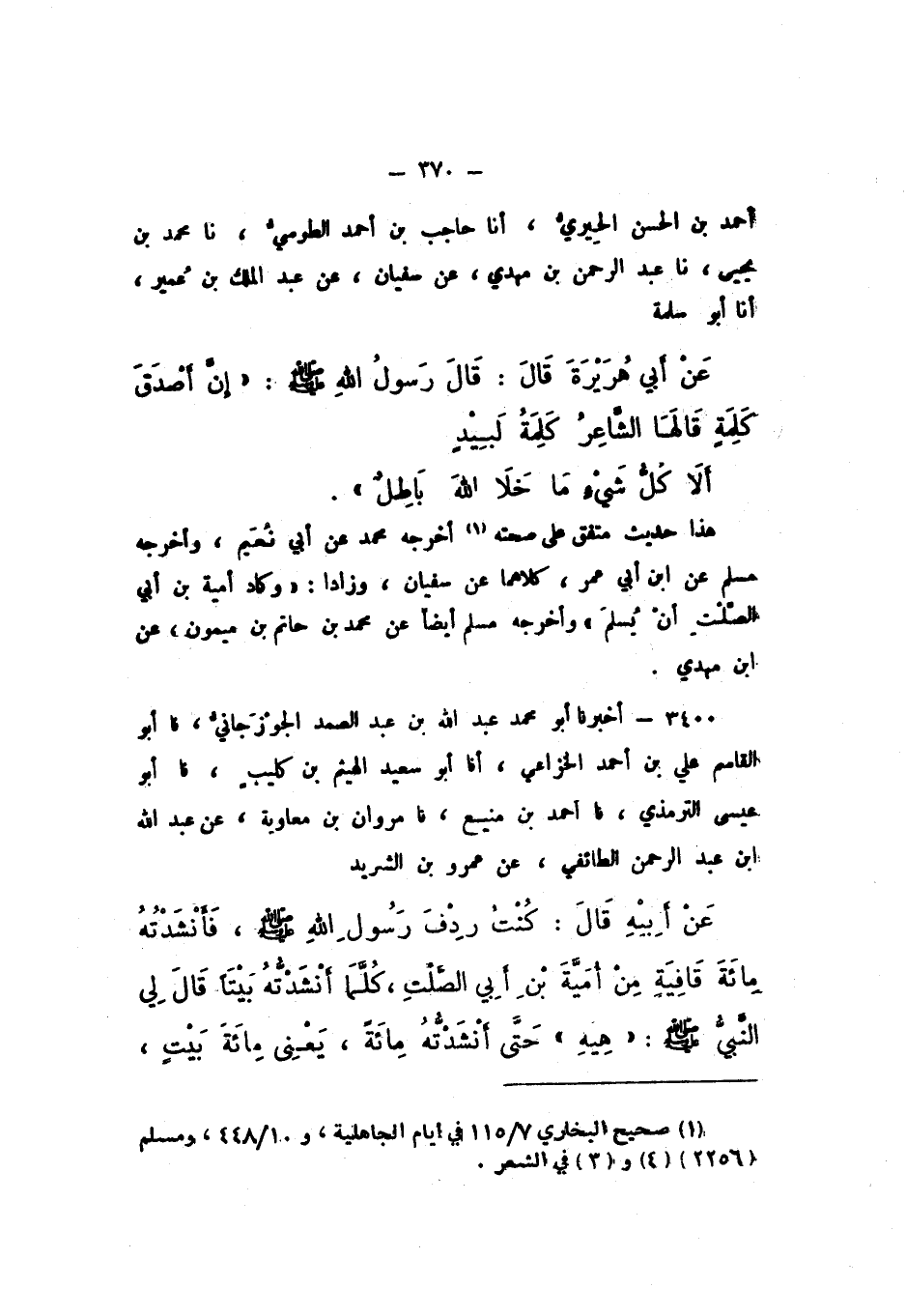 أَحْمَدُ بْنُ الْحَسَنِ الْحِيرِيُّ، أَنا حَاجِبُ بْنُ أَحْمَدَ الطُّوسِيُّ، نَا مُحَمَّدُ بْنُ يَحْيَى، نَا عَبْدُ الرَّحْمَنِ بْنُ مَهْدِيٍّ، عَنْ سُفْيَانَ، عَنْ عَبْدِ الْمَلِكِ بْنِ عُمَيْرٍ، أَنا أَبُو سَلَمَةَ، عَنْ أَبيِ هُرَيْرَةَ، قَالَ: قَالَ رَسُولُ اللَّهِ صَلَّى اللهُ عَلَيْهِ وَسَلَّمَ: " إِنَّ أَصْدَقَ كَلِمَةٍ قَالَهَا الشَّاعِرُ كَلِمَةُ لَبِيدٍ: