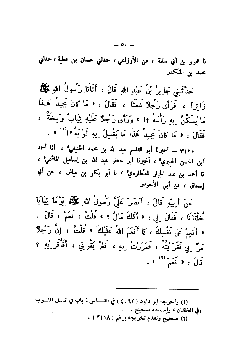 3120 - أَخْبَرَنَا أَبُو الْقَاسِمِ عَبْدُ اللَّهِ بْنُ مُحَمَّدٍ الْحُنَيْفِيُّ أَنا أَحْمَدُ بْنُ الْحَسَنِ الْحِيرِيُّ، أَخْبَرَنَا أَبُو جَعْفَرٍ عَبْدُ اللَّهِ بْنُ إِسْمَاعِيلَ الْهَاشِمِيُّ، نَا أَحْمَدُ بْنُ عَبْدِ الْجَبَّارِ الْعُطَارِدِيُّ، نَا أَبُو بَكْرِ بْنُ عَيَّاشٍ، عَنْ أَبِي إِسْحَاقَ، عَنْ أَبِي الأَحْوَصِ، عَنْ أَبِيهِ، قَالَ: " أَبْصَرَ عَلَيَّ رَسُولُ اللَّهِ صَلَّى اللهُ عَلَيْهِ وَسَلَّمَ يَوْمًا ثِيَابًا خُلْقَانًا، فَقَالَ لِي: أَلَكَ مَالٌ؟ قُلْتُ: نَعَمْ، قَالَ: أَنْعِمْ عَلَى نَفْسِكَ، كَمَا أَنْعَمَ اللَّهُ عَلَيْكَ، قُلْتُ: إِنَّ رَجُلا مَرَّ بِي فَقَرَيْتُهُ، فَمَرَرْتُ بِهِ، فَلَمْ يَقْرِنِي، أَفَأَقْرِيهِ؟ قَالَ: نَعَمْ "