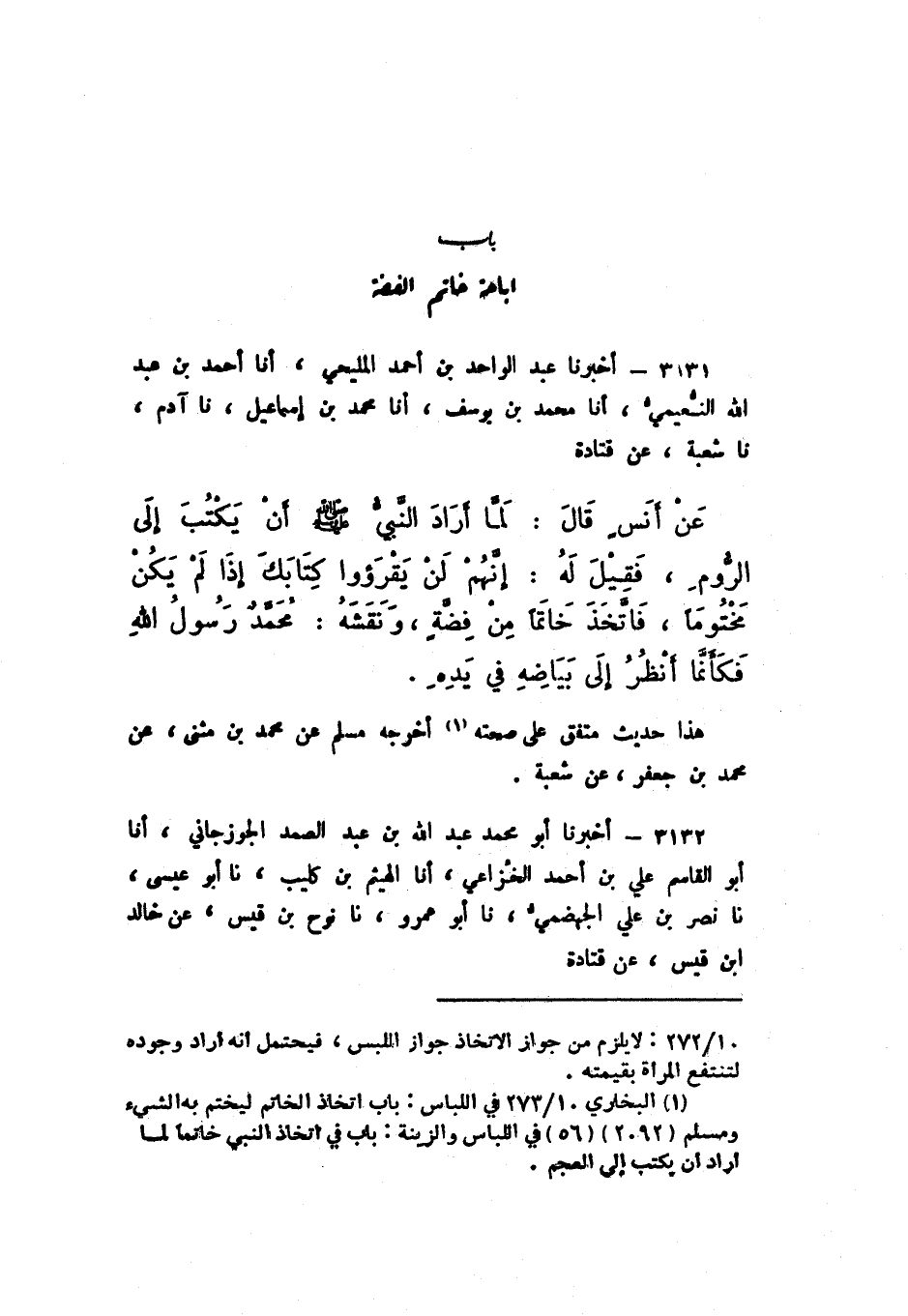 3131 - أَخْبَرَنَا عَبْدُ الْوَاحِدِ بْنُ أَحْمَدَ الْمَلِيحِيُّ، أَنا أَحْمَدُ بْنُ عَبْدِ اللَّهِ النُّعَيْمِيُّ، أَنا مُحَمَّدُ بْنُ يُوسُفَ، أَنا مُحَمَّدُ بْنُ إِسْمَاعِيلَ، نَا آدَمُ، نَا شُعْبَةُ، عَنْ قَتَادَةَ، عَنْ أَنَسٍ، قَالَ: " لَمَّا أَرَادَ النَّبيُّ صَلَّى اللهُ عَلَيْهِ وَسَلَّمَ أَنْ يَكْتُبَ إِلَى الرُّومِ، فَقِيلَ لَهُ: إِنَّهُمْ لَنْ يَقْرَءُوا كِتَابَكَ إِذَا لَمْ يَكنْ مَخْتُومًا، فَاتَّخَذَ خَاتَمًا مِنْ فِضَّةٍ، وَنَقَشَهُ: مُحَمَّدٌ رَسُولُ اللَّهِ، فَكَأَنَّمَا أَنْظُرُ إِلَى بَيَاضِهِ فِي يدِهِ ".