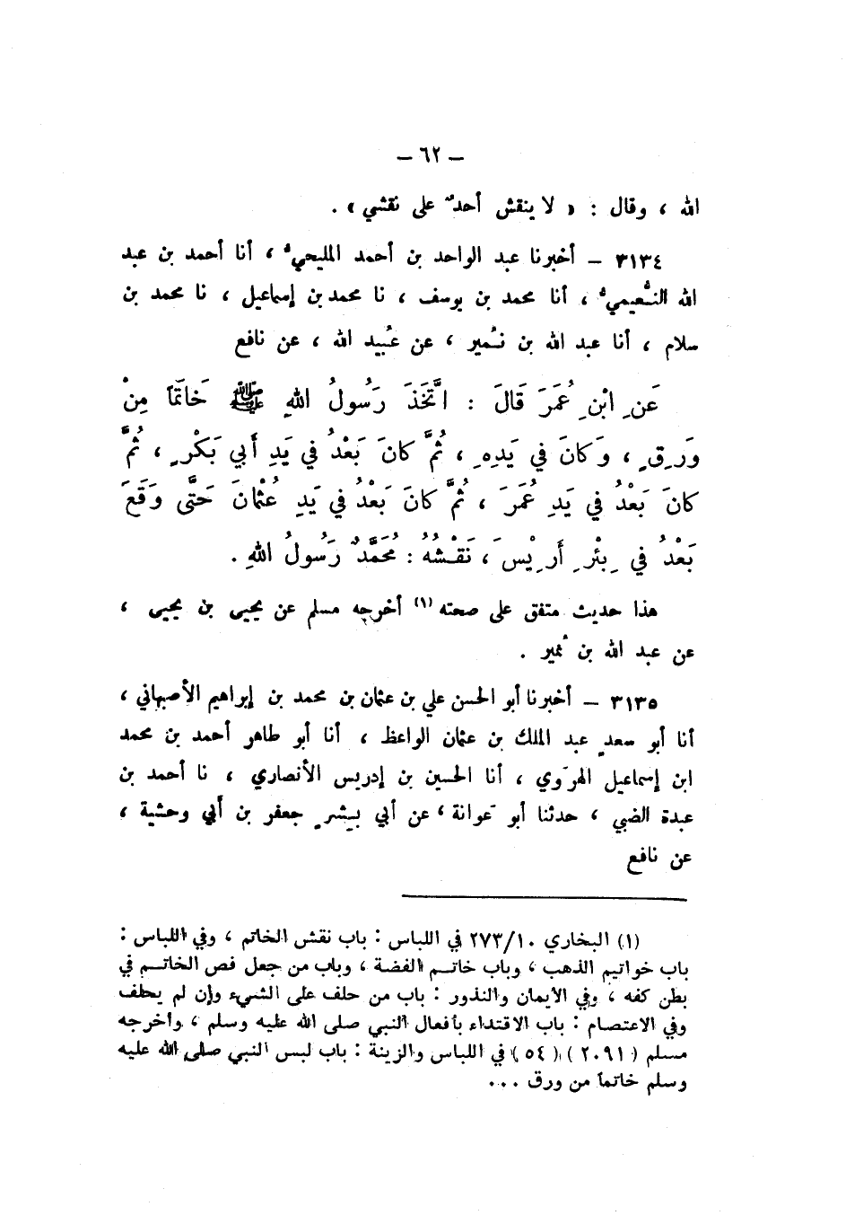 3134 - أَخْبَرَنَا عَبْدُ الْوَاحِدِ بْنُ أَحْمَدَ الْمَلِيحِيُّ، أَنا أَحْمَدُ بْنُ عَبْدِ اللَّهِ النُّعَيْمِيُّ، أَنا مُحَمَّدُ بْنُ يُوسُفَ، نَا مُحَمَّدُ بْنُ إِسْمَاعِيلَ، نَا مُحَمَّدُ بْنُ سَلامٍ، أَنا عَبْدُ اللَّهِ بْنُ نُمَيْرٍ، عَنْ عُبَيْدِ اللَّهِ، عَنْ نَافِعٍ، عَنِ ابْنِ عُمَرَ، قَالَ: " اتَّخَذَ رَسُولُ اللَّهِ صَلَّى اللهُ عَلَيْهِ وَسَلَّمَ خَاتَمًا مِنْ وَرِقٍ، وَكَانَ فِي يَدِهِ، ثُمَّ كَانَ بَعْدُ فِي يَدِ أَبِي بَكْرٍ، ثُمَّ كَانَ بَعْدُ فِي يَدِ عُمَرَ، ثُمَّ كَانَ بَعْدُ فِي يَدِ عُثْمانَ حَتَّى وَقَعَ بَعْدُ فِي بِئْرِ أَرِيسَ، نَقْشُهُ: مُحمَّدٌ رَسُولُ اللَّهِ ".