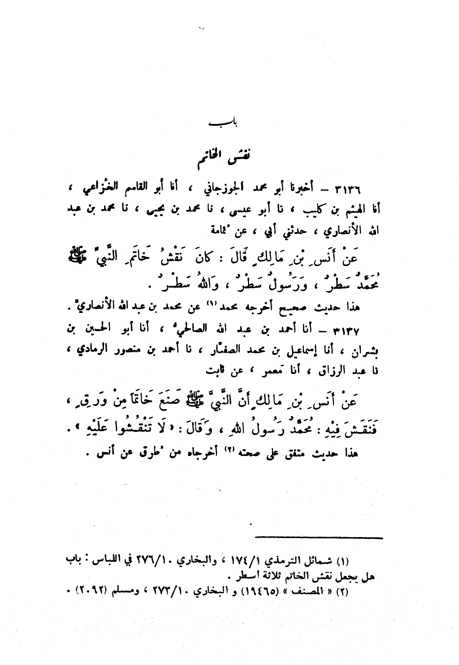 3136 - أَخْبَرَنَا أَبُو مُحَمَّدٍ الْجَوْزَجَانِيُّ، أَنا أَبُو الْقَاسِمِ الْخُزَاعِيُّ، أَنا الْهَيْثَمُ بْنُ كُلَيْبٍ، نَا أَبُو عِيسَى، نَا مُحَمَّدُ بْنُ يَحْيَى، نَا مُحَمَّدُ بْنُ عَبْدِ اللَّهِ الأَنْصَارِيُّ، حَدَّثَنِي أَبِي، عَنْ ثُمَامَةَ، عَنِ أَنَسِ بْنِ مَالِكٍ، قَالَ: «كَانَ نَقْشُ خَاتَمِ النَّبيِّ صَلَّى اللهُ عَلَيْهِ وَسَلَّمَ مُحَمَّدٌ سَطْرٌ، وَرَسُولُ سَطْرٌ، وَاللَّهِ سَطْرٌ».