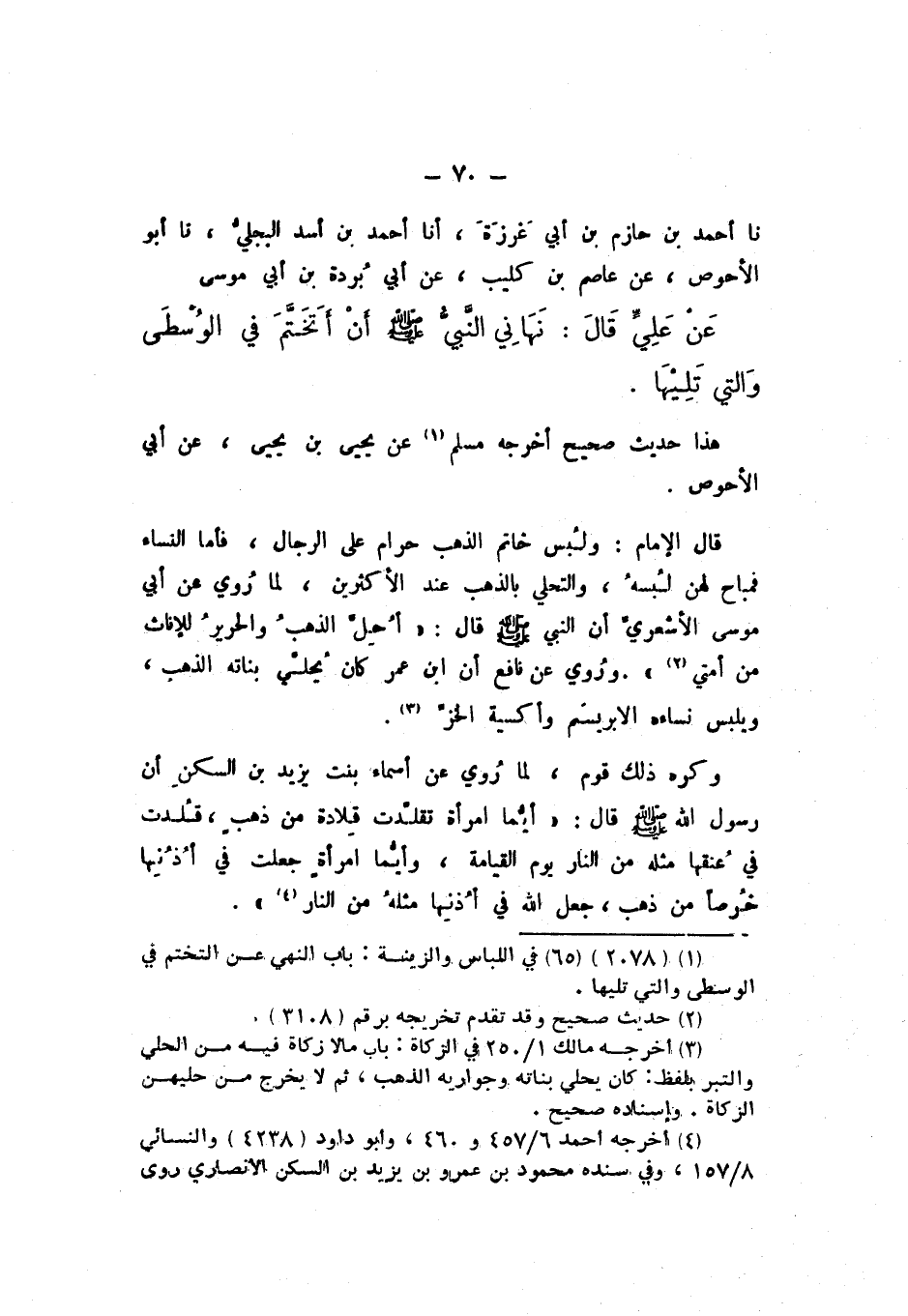 وَكَرِهَ ذَلِكَ قَوْمٌ، لِمَا رُوِيَ عَنْ أَسْمَاءَ بِنْتِ يَزِيدَ بْنِ السَّكَنِ، أَنَّ رَسُولَ اللَّهِ صَلَّى اللهُ عَلَيْهِ وَسَلَّمَ، قَالَ: «أَيُّمَا امْرَأَةٍ تَقَلَّدَتْ قِلادَةً مِنْ ذَهَبٍ، قُلِّدَتْ فِي عُنُقِهَا مِثْلَهُ مِنَ النَّارِ يَوْمَ الْقِيَامَةِ، وَأَيُّمَا امْرَأةٍ جَعَلَتْ فِي أُذُنِهَا خُرْصًا مِنْ ذَهَبٍ، جَعَلَ اللَّهُ فِي أُذنِهَا مِثْلَهُ مِنَ النَّارِ».