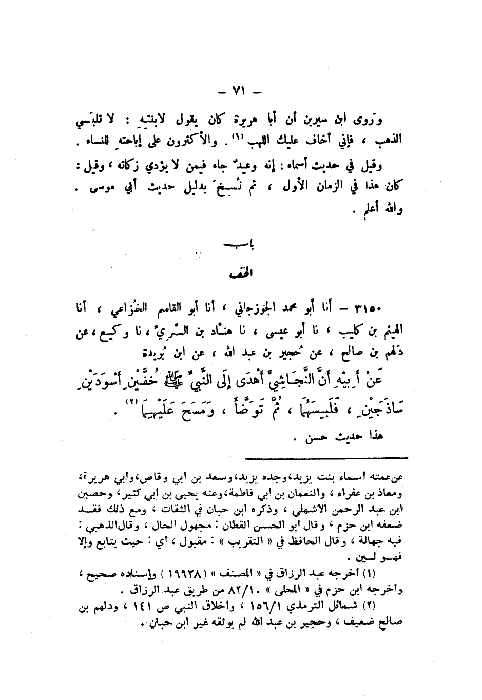 3150 - أَنا أَبُو مُحَمَّدٍ الْجَوْزَجَانِيُّ، أَنا أَبُو الْقَاسِمِ الْخُزَاعِيُّ، أَنا الْهَيْثَمُ بْنُ كُلَيْبٍ، نَا أَبُو عِيسَى، نَا هَنَّادُ بْنُ السَّرِيِّ، نَا وَكِيعٌ، عَنْ دَلْهَمِ بْنِ صَالِحٍ، عَنْ حُجَيْرِ بْنِ عَبْدِ اللَّهِ، عَنِ ابْنِ بُرَيْدَةَ، عَنْ أَبِيهِ، «أَنَّ النَّجَاشِيَّ أَهْدَى إِلَى النبَّيِّ صَلَّى اللهُ عَلَيْهِ وَسَلَّمَ خُفَّيْنِ أَسْوَدَيْنِ سَاذَجَيْنِ، فَلَبِسَهُمَا، ثُمَّ تَوَضَّأَ، وَمَسَحَ عَلَيْهِمَا».