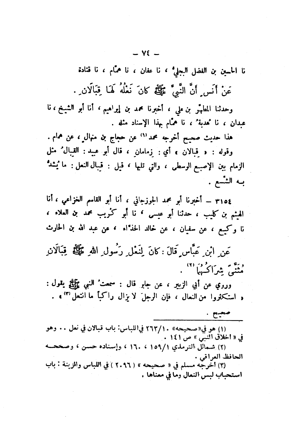 نَا الْحُسَيْنُ بْنُ الْفَضْلِ الْبَجَلِيُّ، نَا عَفَّانُ، نَا هَمَّامٌ، نَا قَتَادَةُ، عَنْ أَنَسٍ، «أَنَّ النَّبِيَّ صَلَّى اللهُ عَلَيْهِ وَسَلَّمَ كَانَ نَعْلُهُ لَهَا قِبَالانِ».
